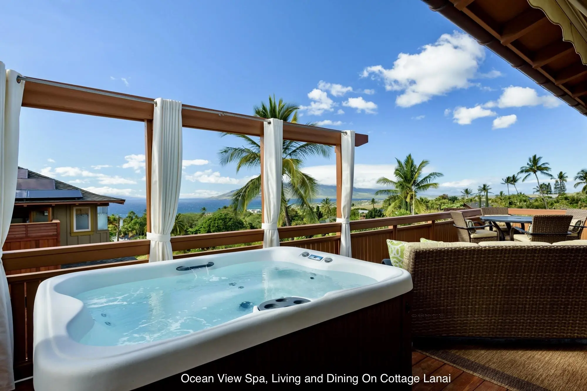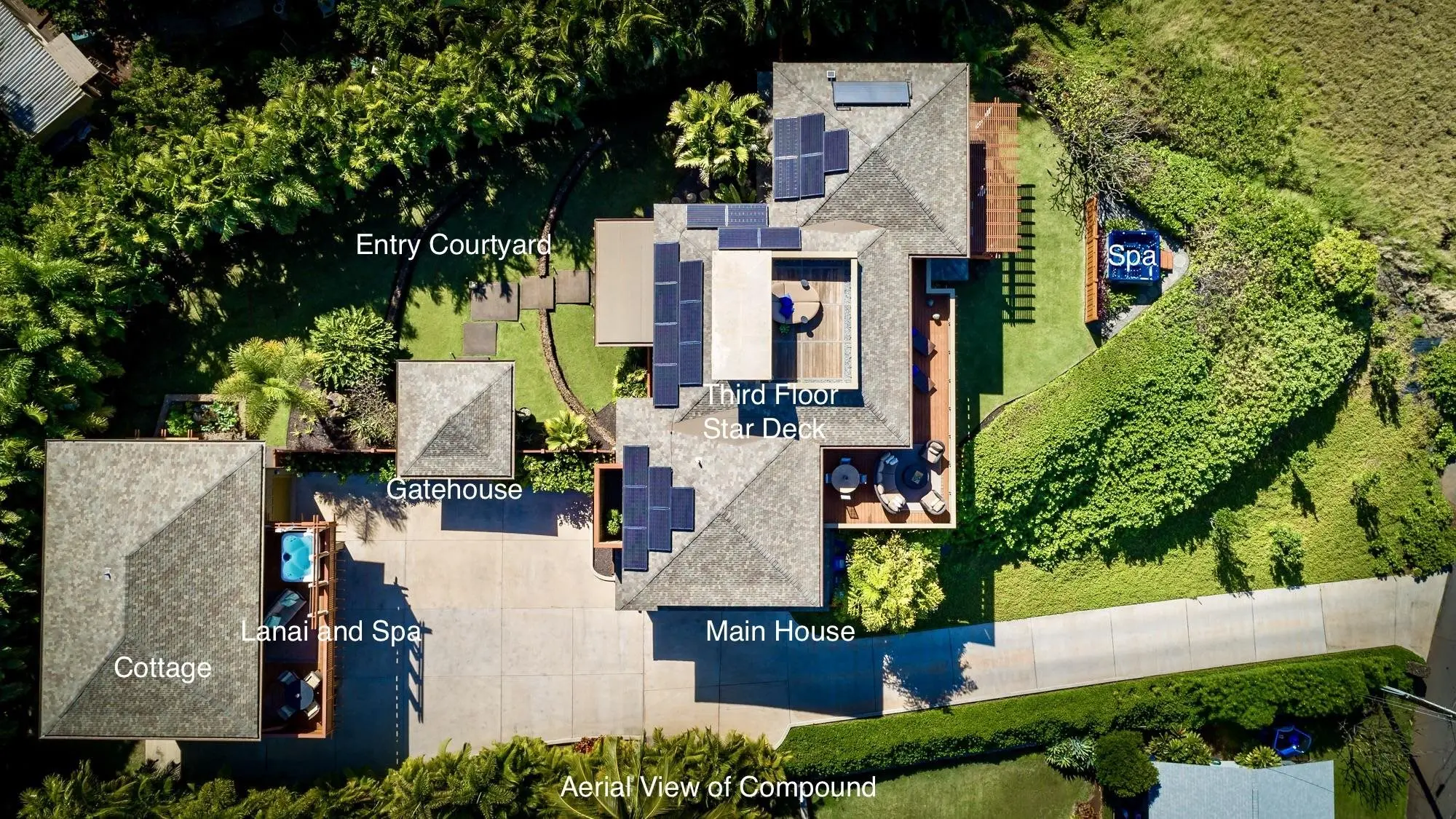 Live an elevated life. Perched 500 feet above sea level and 25 to 45 feet above the street, this fully furnished and outfitted, turn-key retreat is a custom-designed master work by architect Greg Bayless: a composition of artful design, natural wonder and seamless functionality. The 3,484 sf interior features a 2,780 sf 3-suite main house and a 704 sf 1-suite guesthouse, ideal for extended family or friends. Move in the day of closing. Each suite offers king beds, private living areas and multiple views exceeding 180°. Professional landscaping creates a tranquil park-like setting. Features 2 hot tubs in separate gardens and 2 private outdoor showers. Sunsets are visible 365 days a year. Live under starlit skies, shooting stars, the Milky Way and all moonsets. Take in stunning panoramic views of the ocean, sky, mountains, coastal lights and multiple outer islands from expansive lanais, a secluded third-level stargazing deck, and from all main rooms. The open-concept kitchen boasts a large island, wet bar and butlerâs pantry. The detached guesthouse is a high-end getaway with a gourmet kitchen and a private lanai with hot tub. Park five vehicles in two large garages totaling 1,280 sf. A self-sufficient state-of-the-art energy system with ample P/V panels and 3 Tesla batteries ensures efficient, sustainable power. Discover peace, privacy, and unmatched natural beauty in this curated Maui property. Itâs a distinctive, intimate home youâll never want to leave. Come and see for yourself.