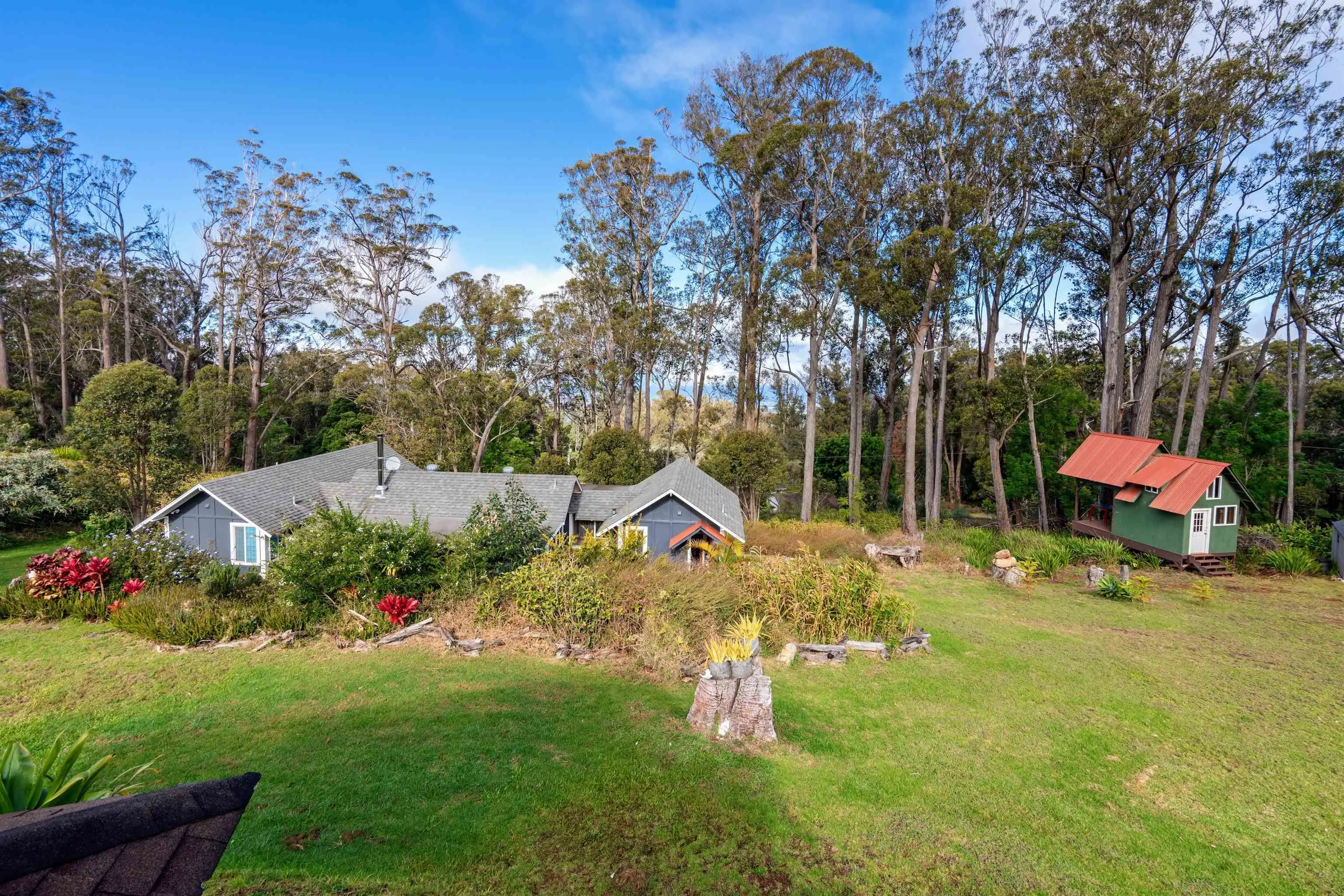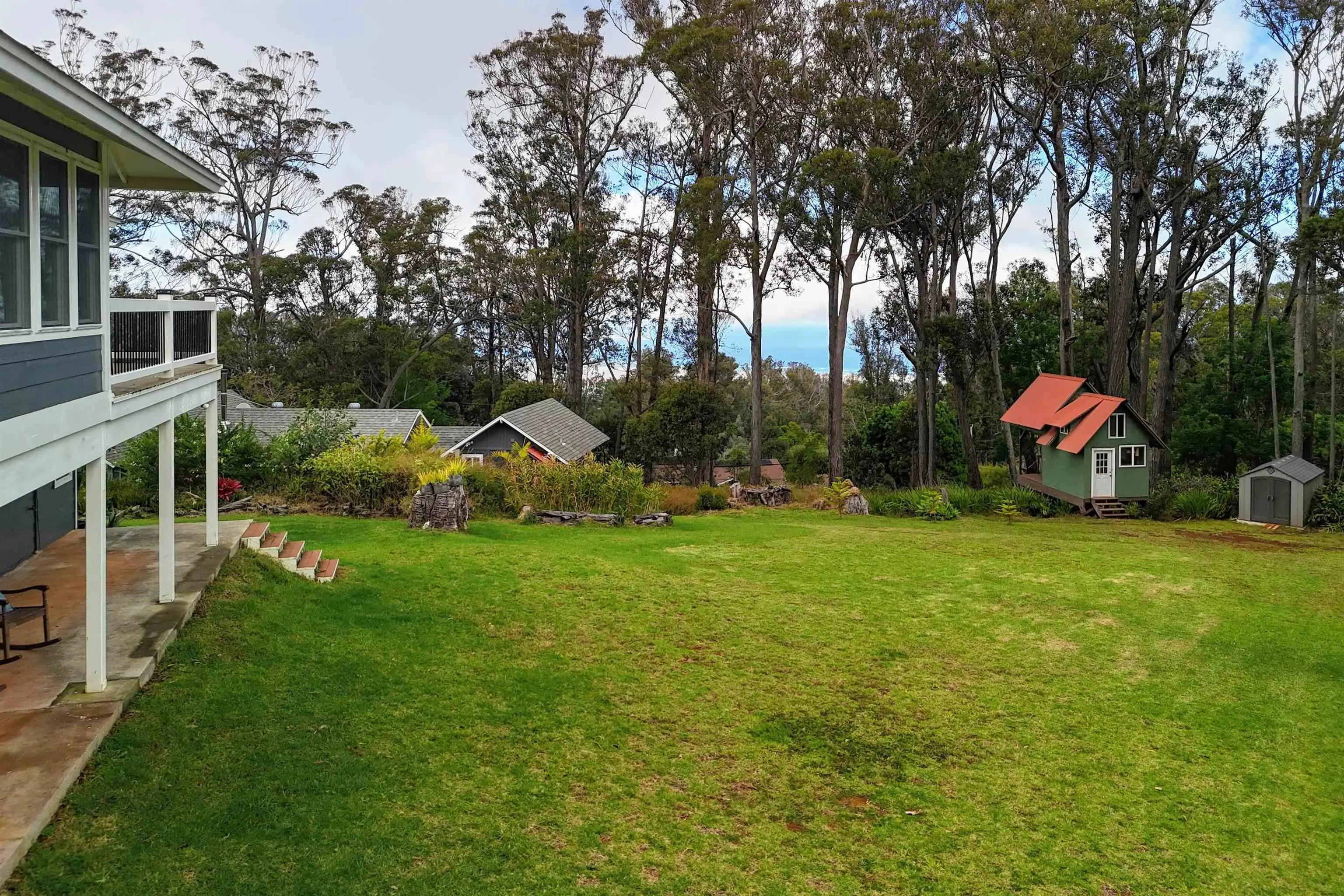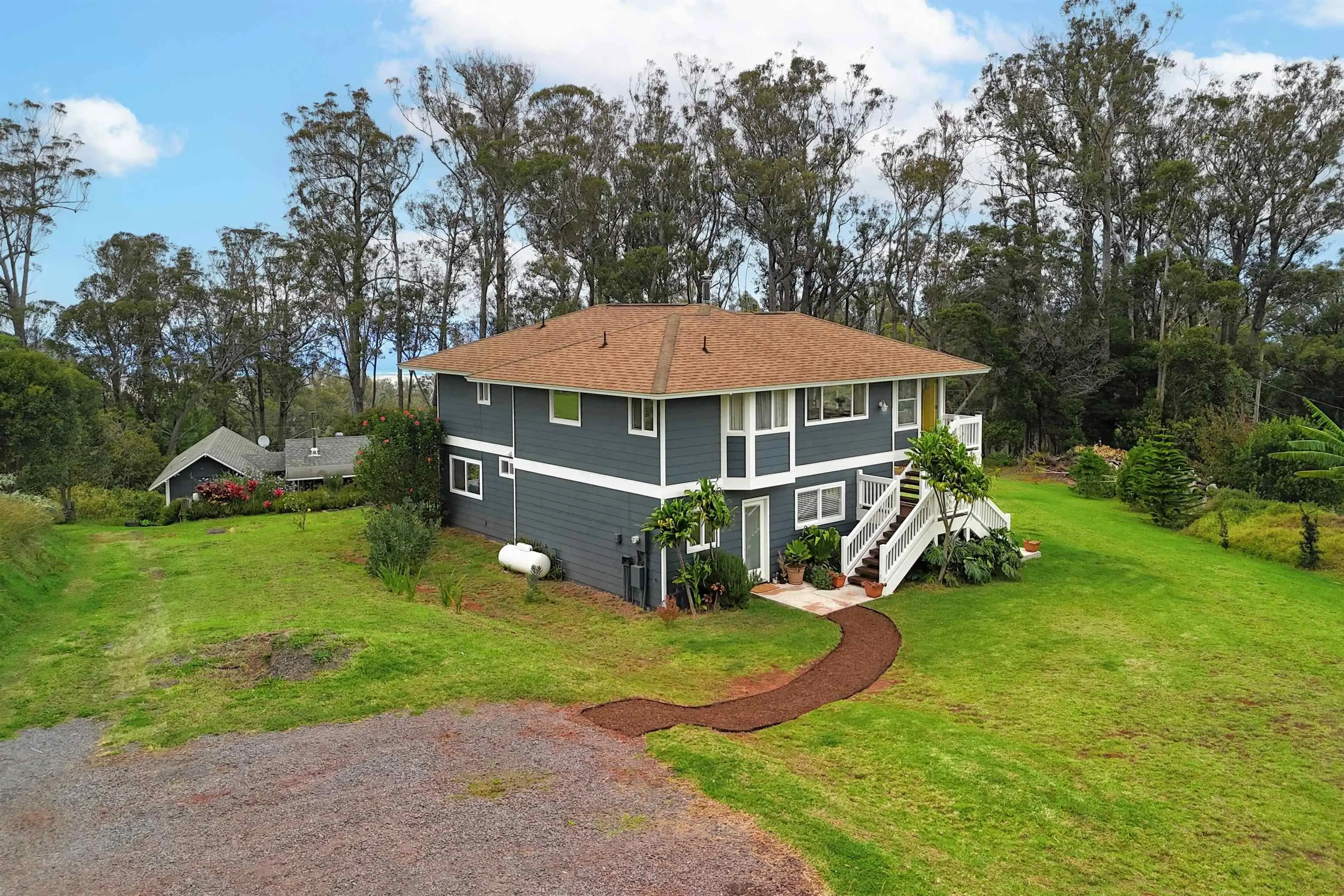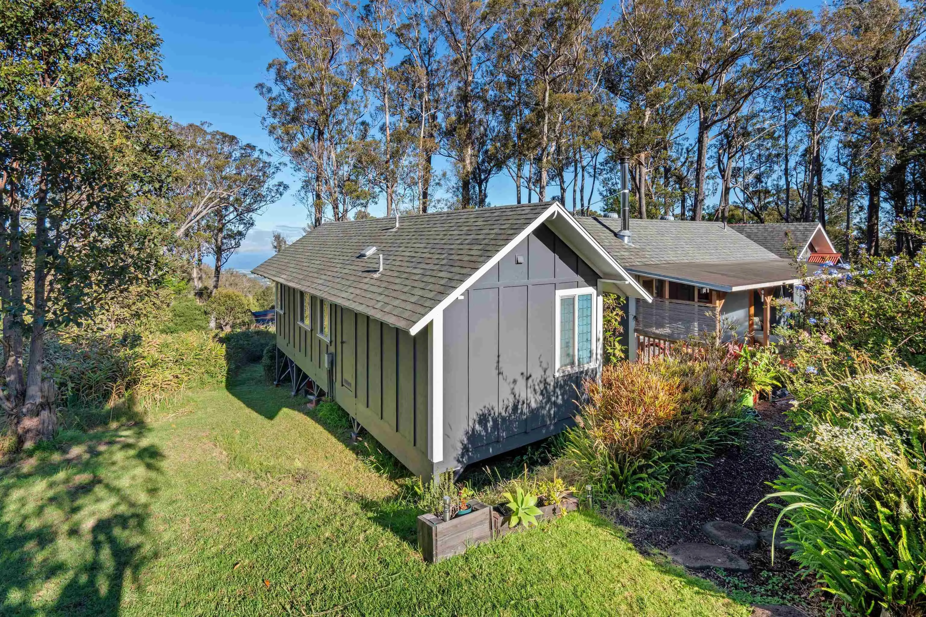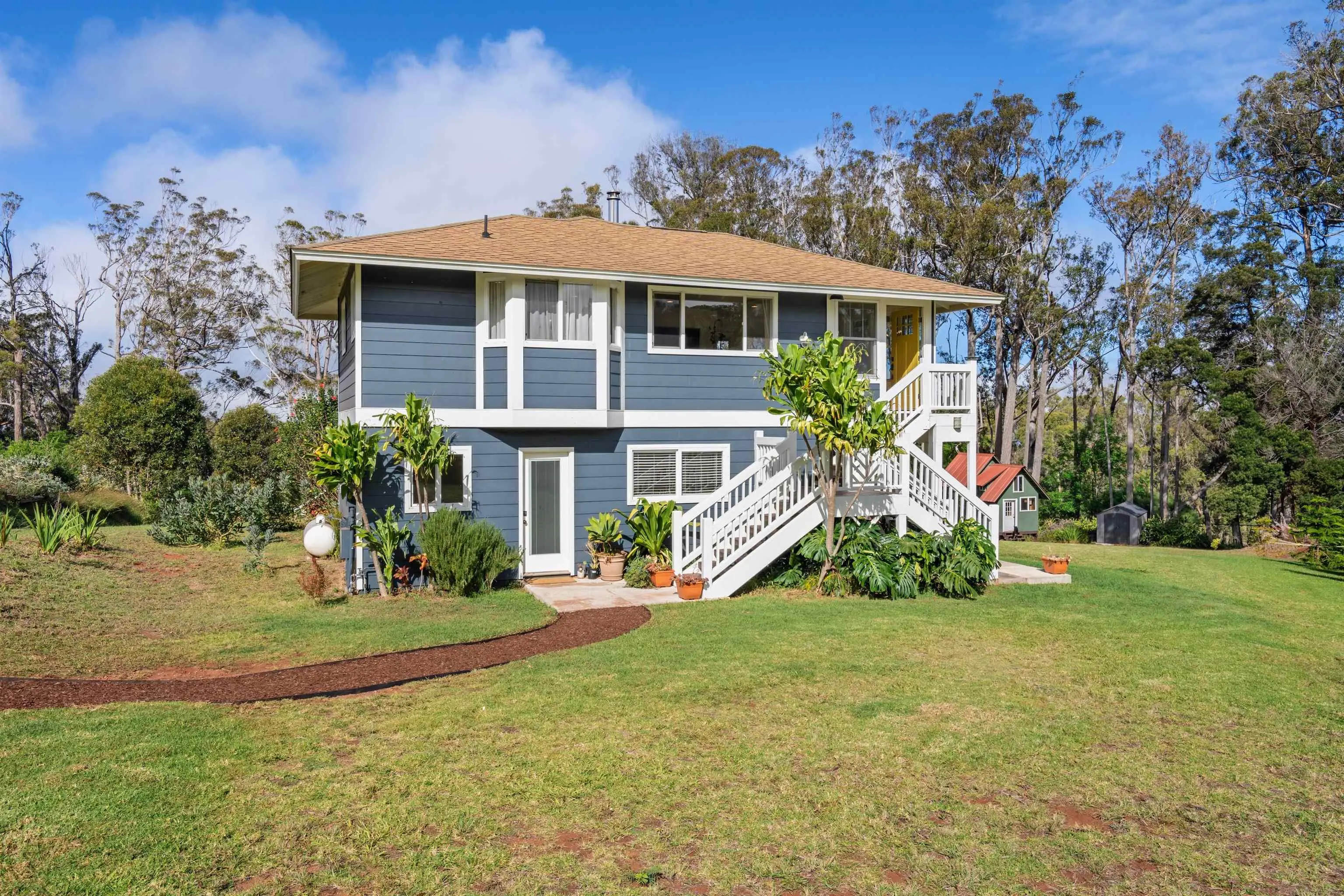 Beautifully contemporary remodeled large home with room(s) for everyone. Upstairs is the main suite, roomy and spacious with a stargazing, Olinda ocean view lanai deck that connects to the expansive comfy living area. Ultra functional kitchen and inviting dining for gathering in the way we live in 2025. The main suite is adjacent to an office or nursery room. Downstairs there are bedrooms surrounding and centered by the den/game area, plus yoga/art/craft room affectionately called “the nest” and laundry room. Furnishings could be included. Both the inside & outside of this property is expansive and ready for the fun. There is the quintessential 2Br/2Ba open design cottage, with fenced yard, including the oh’s and aw’s and fantastic tenants. The grounds have trails for biking/walking and a storage unit and a multilevel tree house, the coolest one you will find, which includes a counter-balance ladder hoist. Enjoy listening to the birds from this peaceful & tranquil Olinda location away from neighboring structures focused on closer proximity to schools, sports and activities. Very well maintained, recently remodeled on 2+ outside-ie fun acres. Enjoy the cooler summers and perfect winter weather. The large trees were removed to create a light bright sweet environment and the trails. Make this your fantastic place to call home. To view Matterport for the cottage, go to https://my.matterport.com/show/?m=nDoAwSnBSyB.