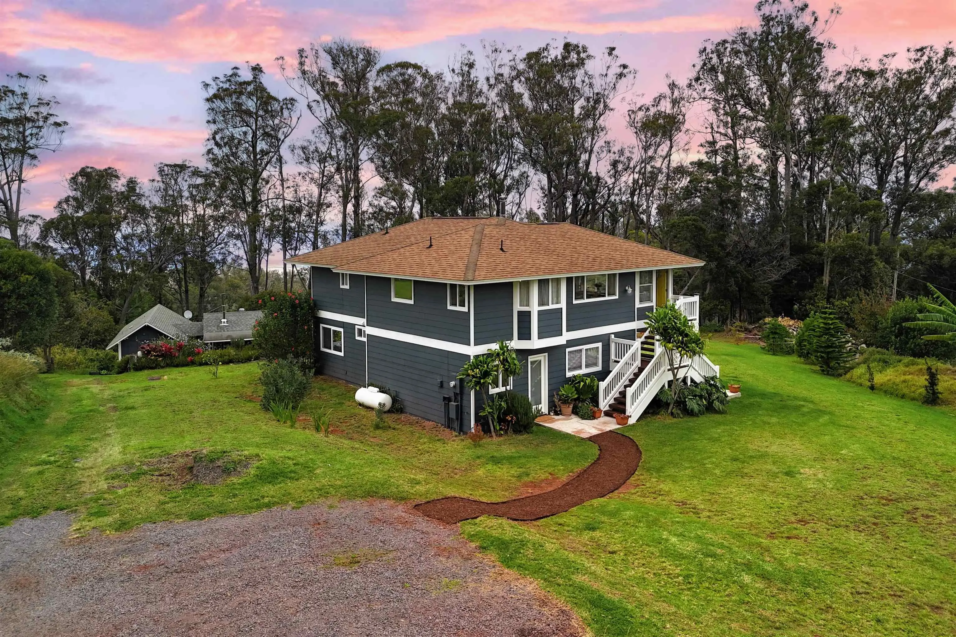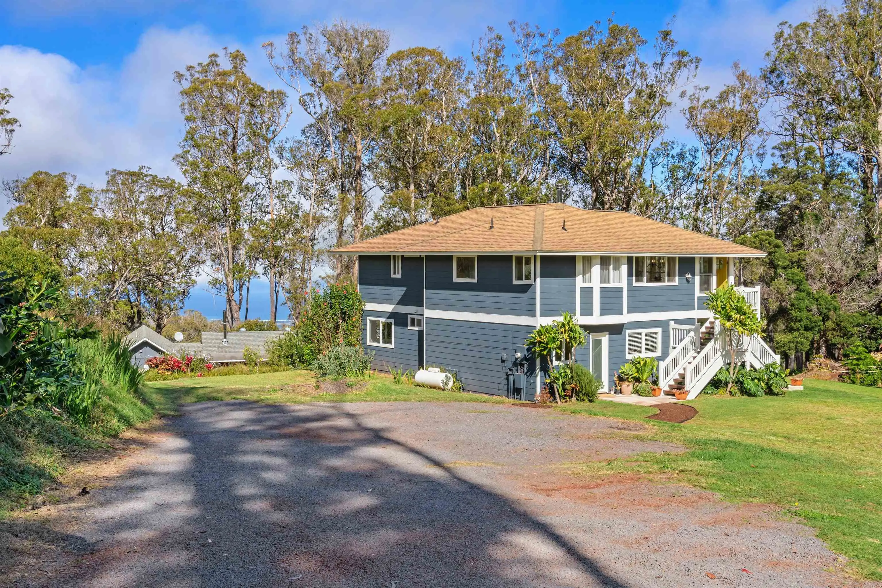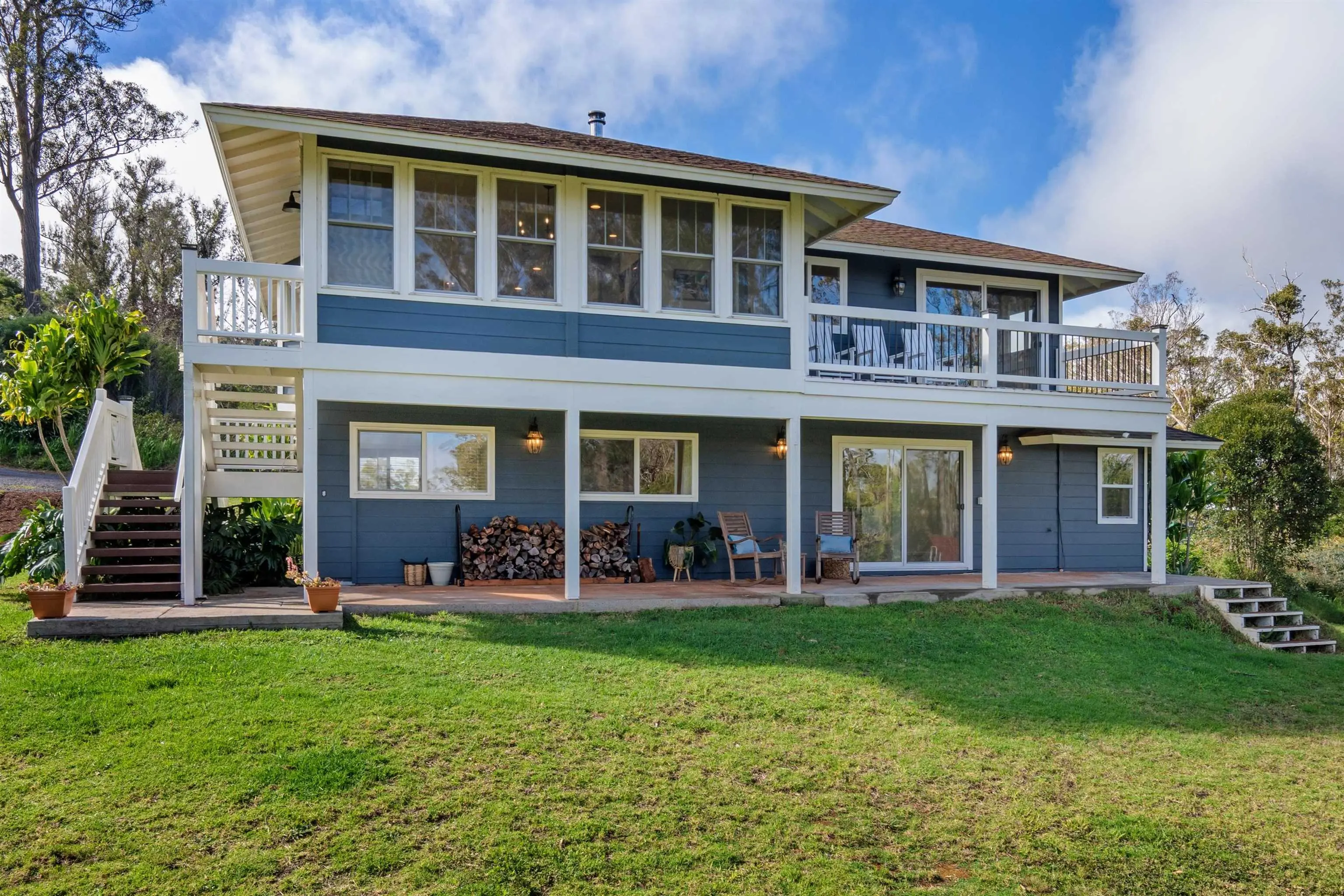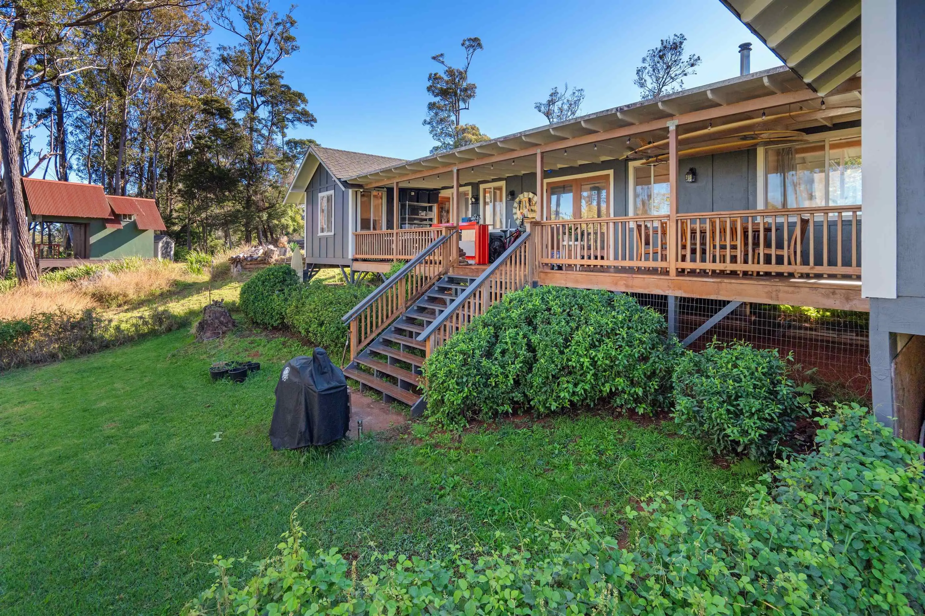 Beautifully contemporary remodeled large home with room(s) for everyone. Upstairs is the main suite, roomy and spacious with a stargazing, Olinda ocean view lanai deck that connects to the expansive comfy living area. Ultra functional kitchen and inviting dining for gathering in the way we live in 2025. The main suite is adjacent to an office or nursery room. Downstairs there are bedrooms surrounding and centered by the den/game area, plus yoga/art/craft room affectionately called “the nest” and laundry room. Furnishings could be included. Both the inside & outside of this property is expansive and ready for the fun. There is the quintessential 2Br/2Ba open design cottage, with fenced yard, including the oh’s and aw’s and fantastic tenants. The grounds have trails for biking/walking and a storage unit and a multilevel tree house, the coolest one you will find, which includes a counter-balance ladder hoist. Enjoy listening to the birds from this peaceful & tranquil Olinda location away from neighboring structures focused on closer proximity to schools, sports and activities. Very well maintained, recently remodeled on 2+ outside-ie fun acres. Enjoy the cooler summers and perfect winter weather. The large trees were removed to create a light bright sweet environment and the trails. Make this your fantastic place to call home. To view Matterport for the cottage, go to https://my.matterport.com/show/?m=nDoAwSnBSyB.