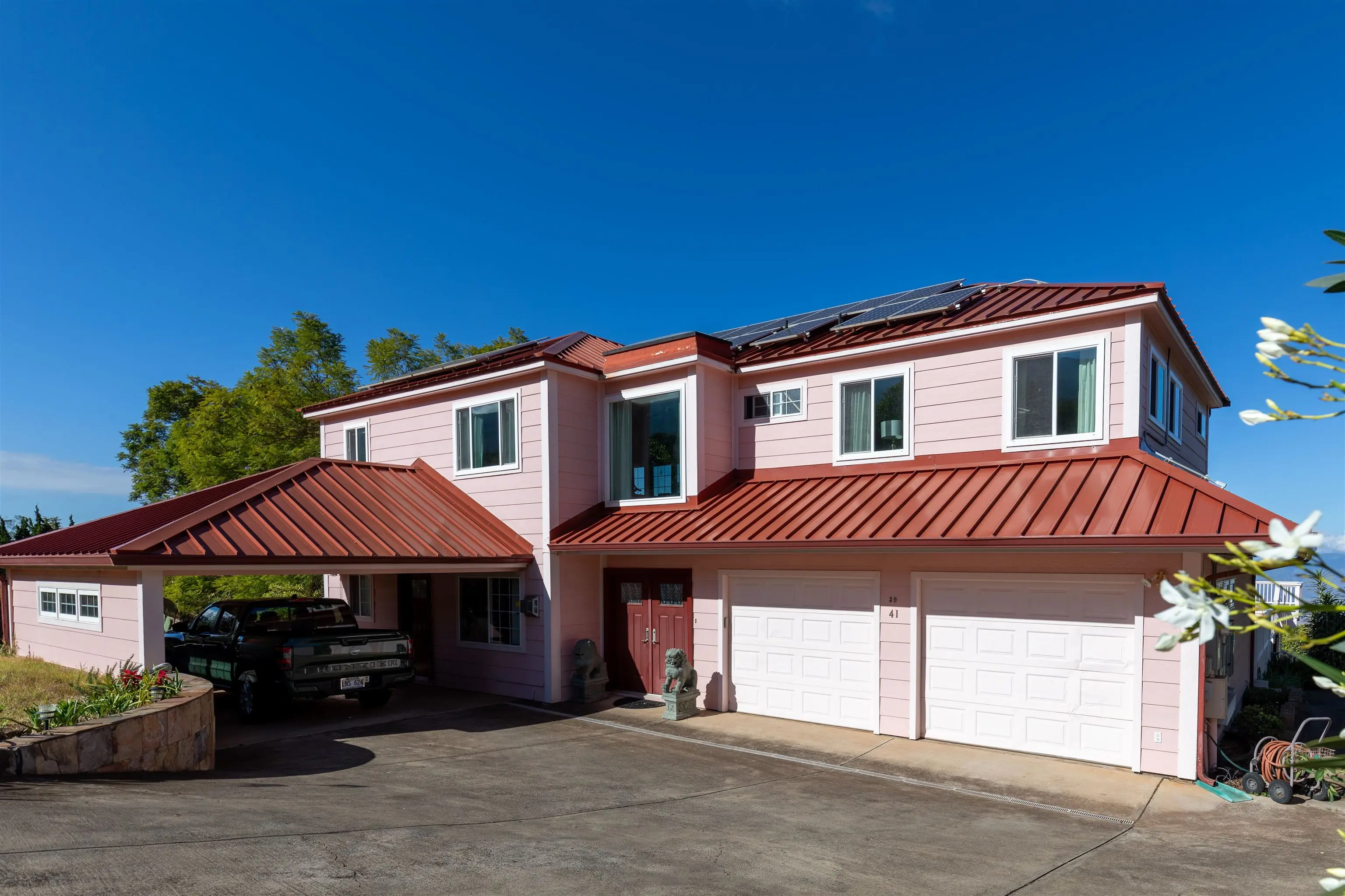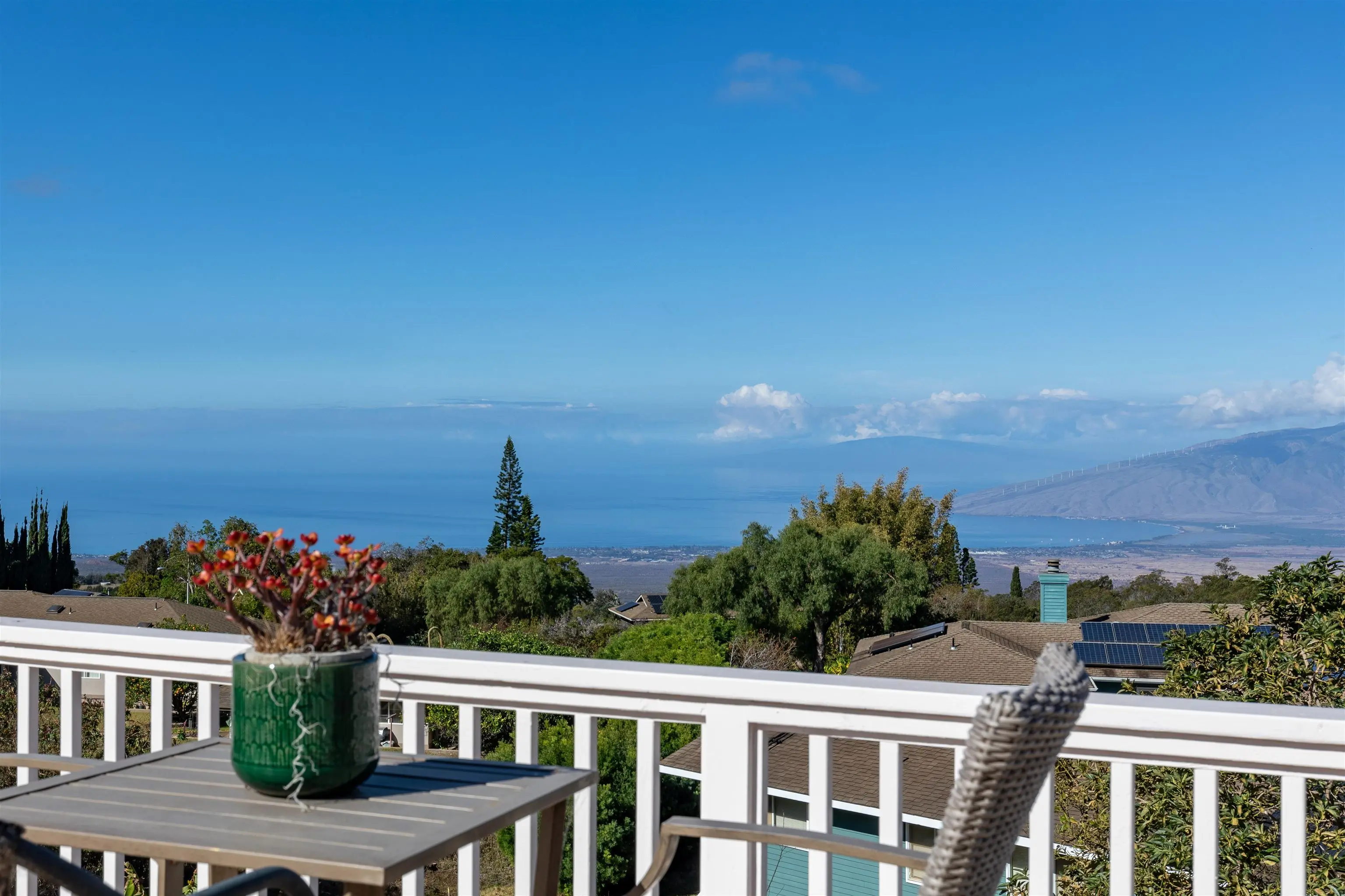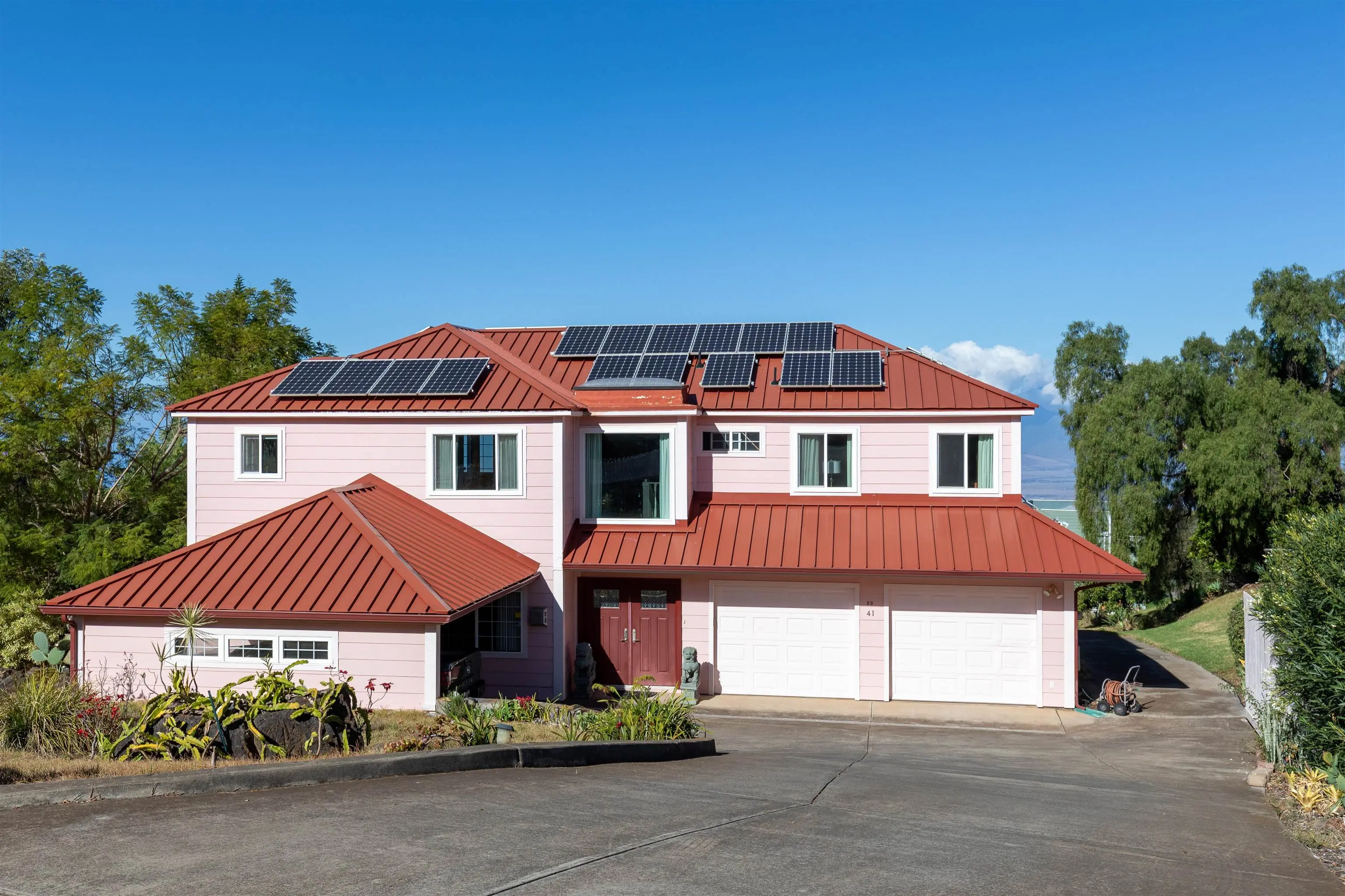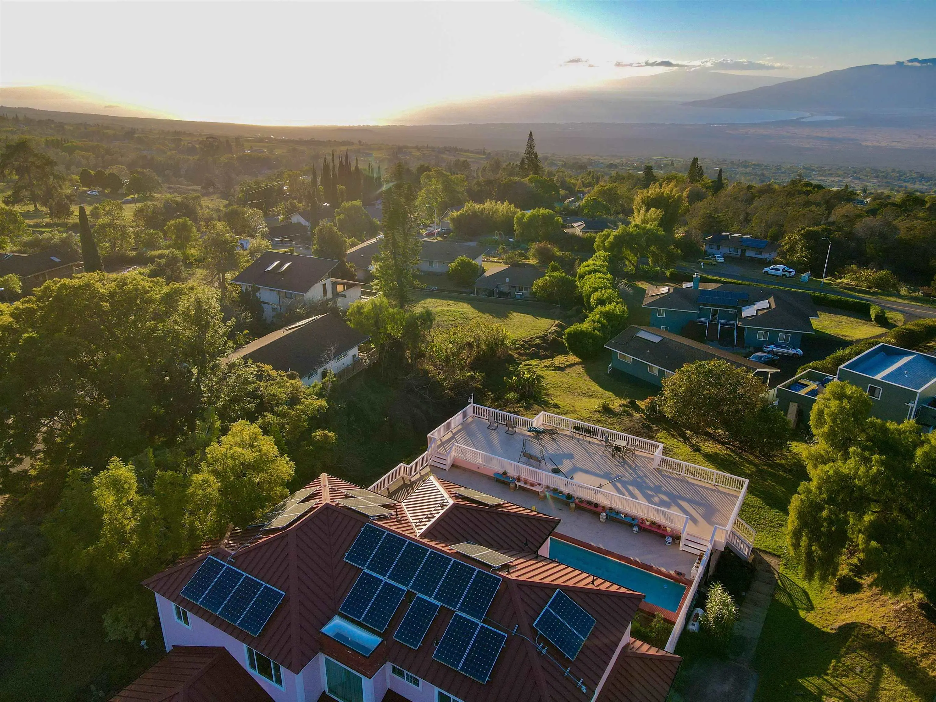 If ever there were a Swiss Army knife of a house, this is it! 39 Kamila Street might be Kula Highlandsâ most flexible property. The main house has an upstairs world, a downstairs world, and a gunite lap pool with a view that dazzles. Just beyond the tranquil blue waters of the pool is a 1600 square-foot deck that not only allows you and your 50 closest friends to enjoy the spectacular sunsets, but it cleverly hides a fully permitted 932 square-foot office and storage room with its own bathroom and its own septic system. Even this office in its lower elevation, enjoys an incredible view. The main house has a spacious and bright open beam upstairs world with remodeled bathrooms and kitchen. The downstairs world has a wet bar area, spacious family room and a large bathroom and bedroom overlooking the pool. The metal roof is flanked with a solar photovoltaic system, and there are two Tesla power walls in the garage to keep your electric life uninterrupted.(26.4 KwH!) Ask your realtor about the legally permitted accessory dwelling musical chairs situation. Priced below recent appraisal.