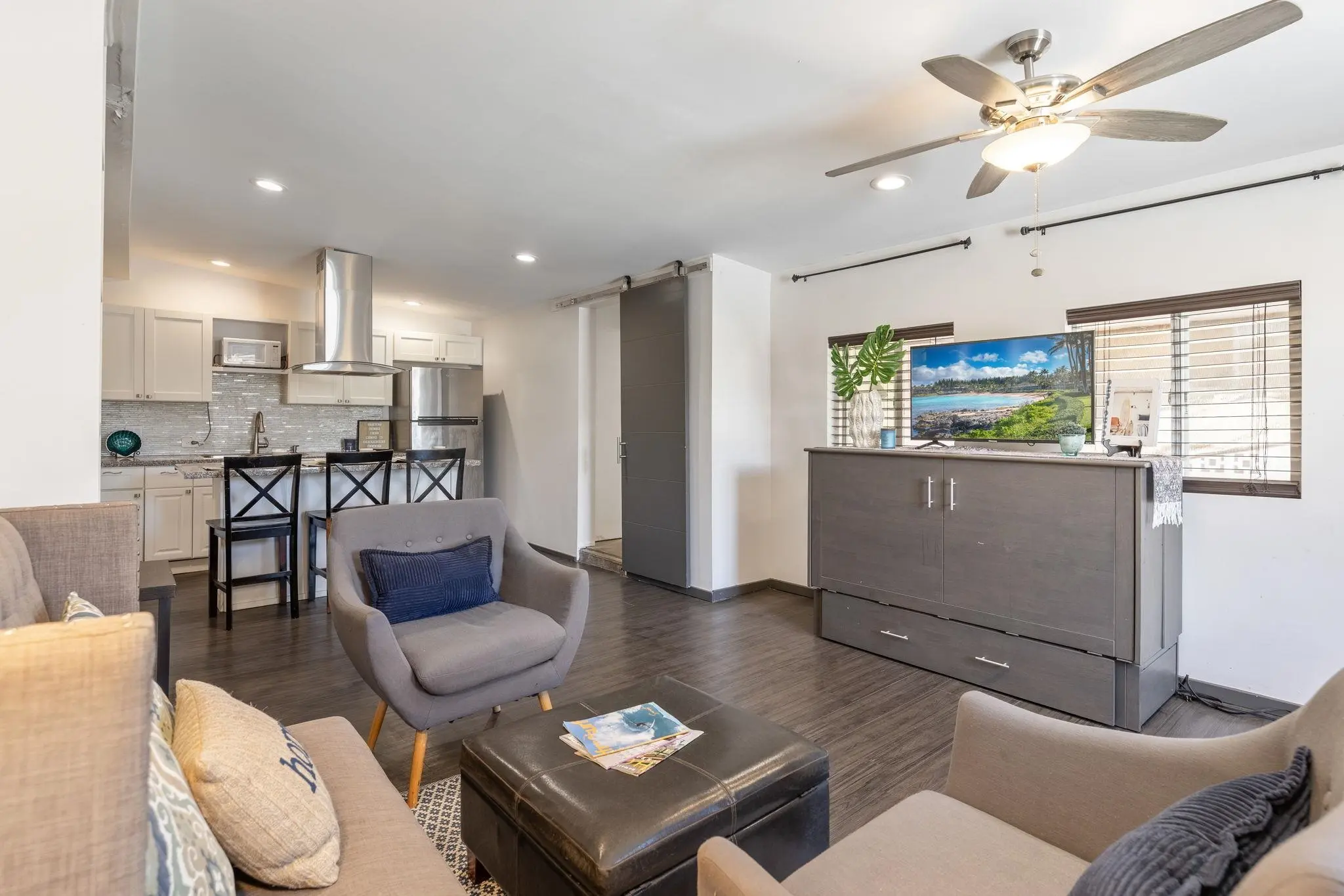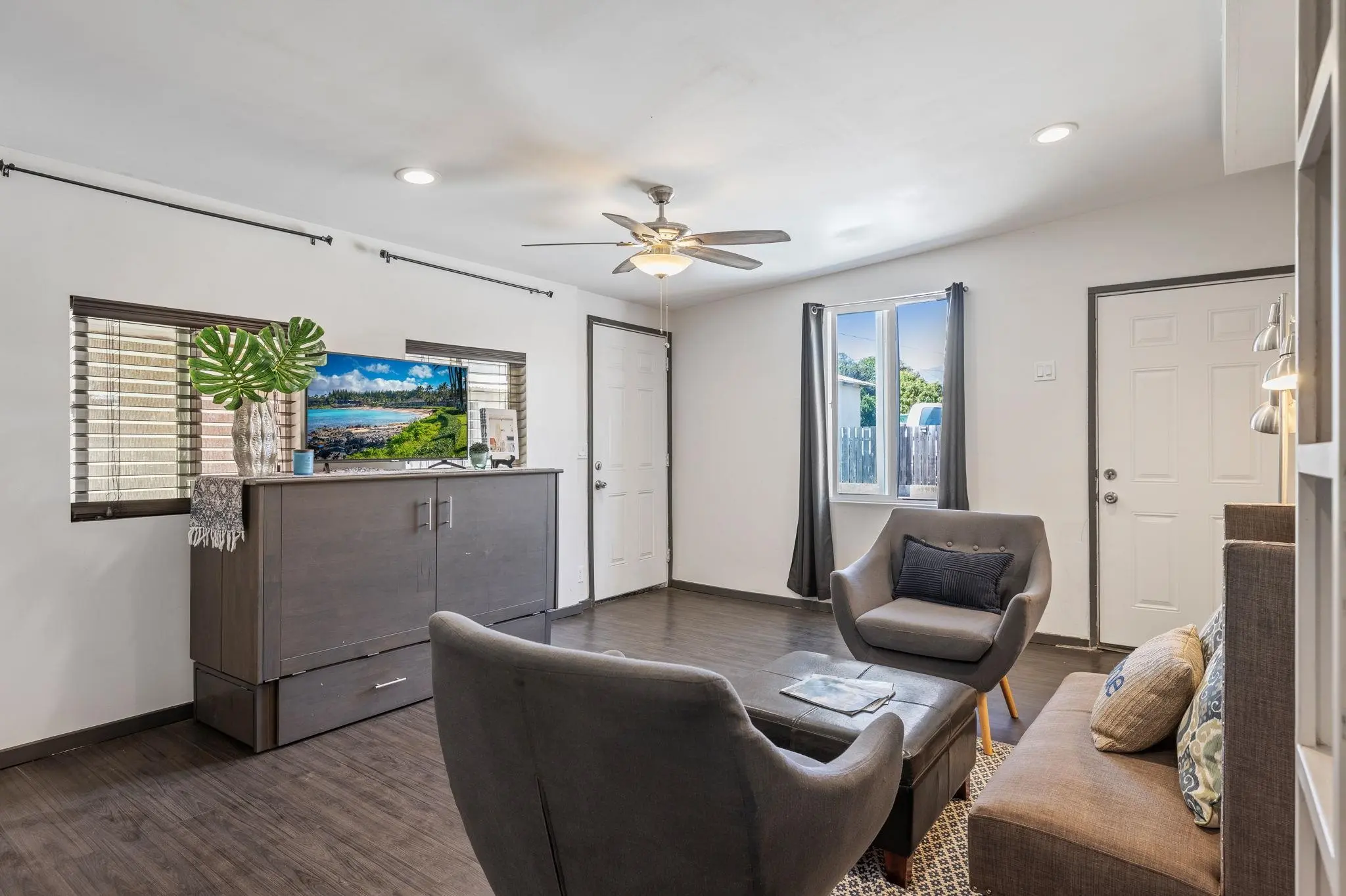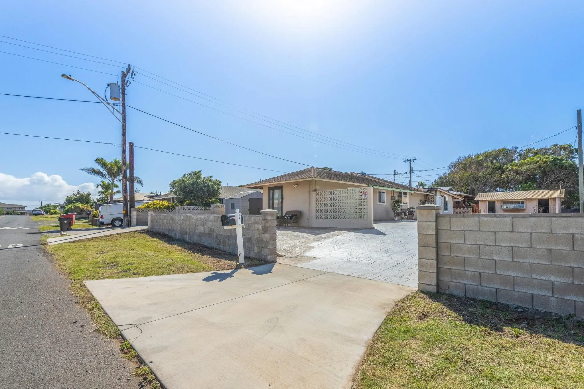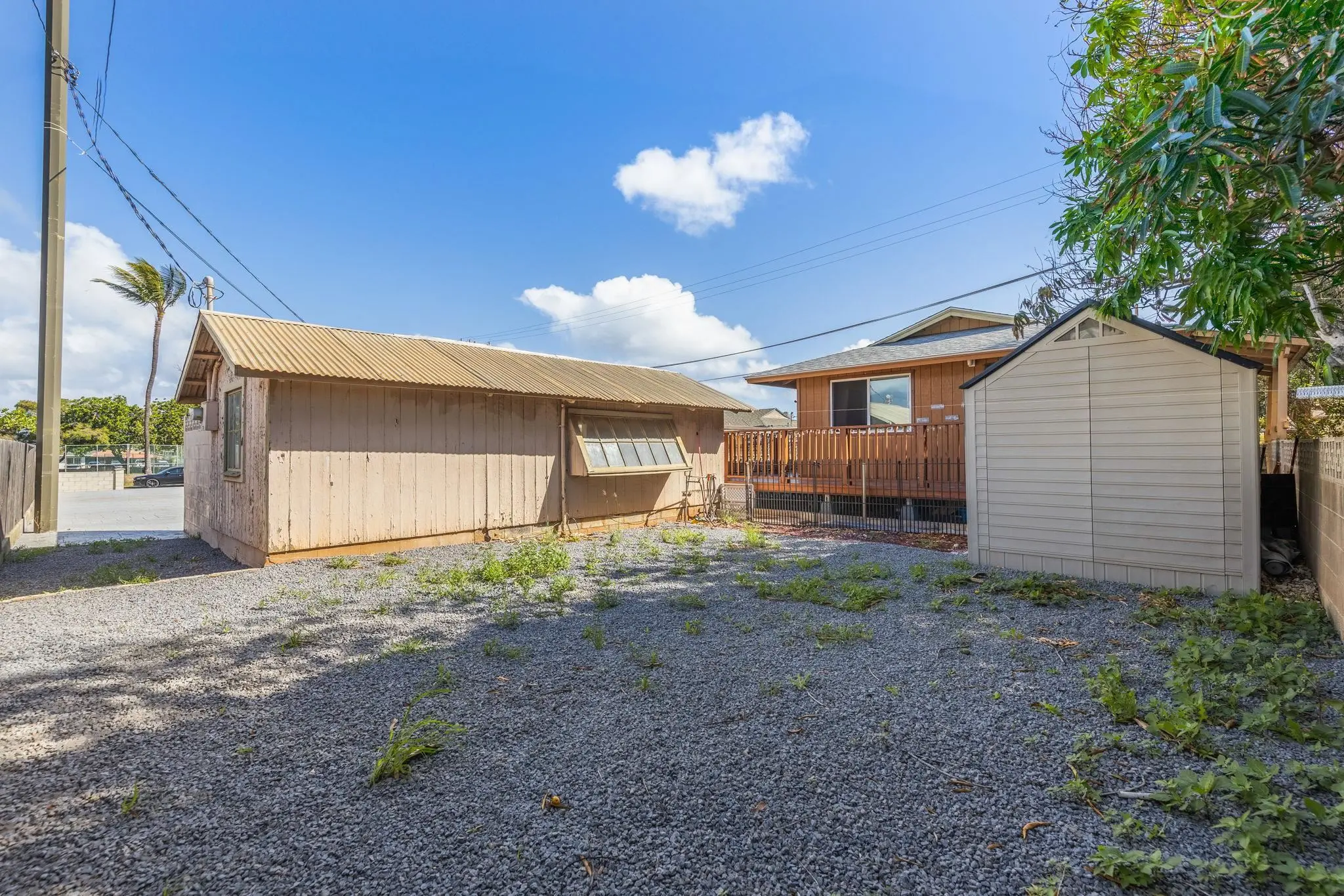 52 Aiai Street is a remodeled, 3 bedroom, 2 bathroom main home and a 2 bedroom, 1 bathroom detached cottage. The main house offers a flexible floor plan that could function as separate living spaces. In the main house, open-concept living and dining areas are ideal for gathering and entertaining. Large windows and modern lighting feel bright and airy, while durable, dark ash flooring offers a stylish contrast. Dual kitchens in the main house offer separate spaces for meal preparation and feature granite countertops, elegant backsplashes, stainless steel appliances and plenty of storage space. Enjoy relaxed dining around the breakfast islands. The main house offers 3 spacious bedrooms and 2 bathrooms with a sleek design, tiled walk-in showers and durable finishes. The 500 square foot detached cottage flows cohesively with the main house design. The cottage includes a cozy front porch, its own yard and storage. Enjoy the outdoor amenities with 3 storage sheds on property, a wide driveway with ample parking space and multiple yards. This property is in a convenient location across the street from the neighborhood park and close to the airport, shopping and dining.