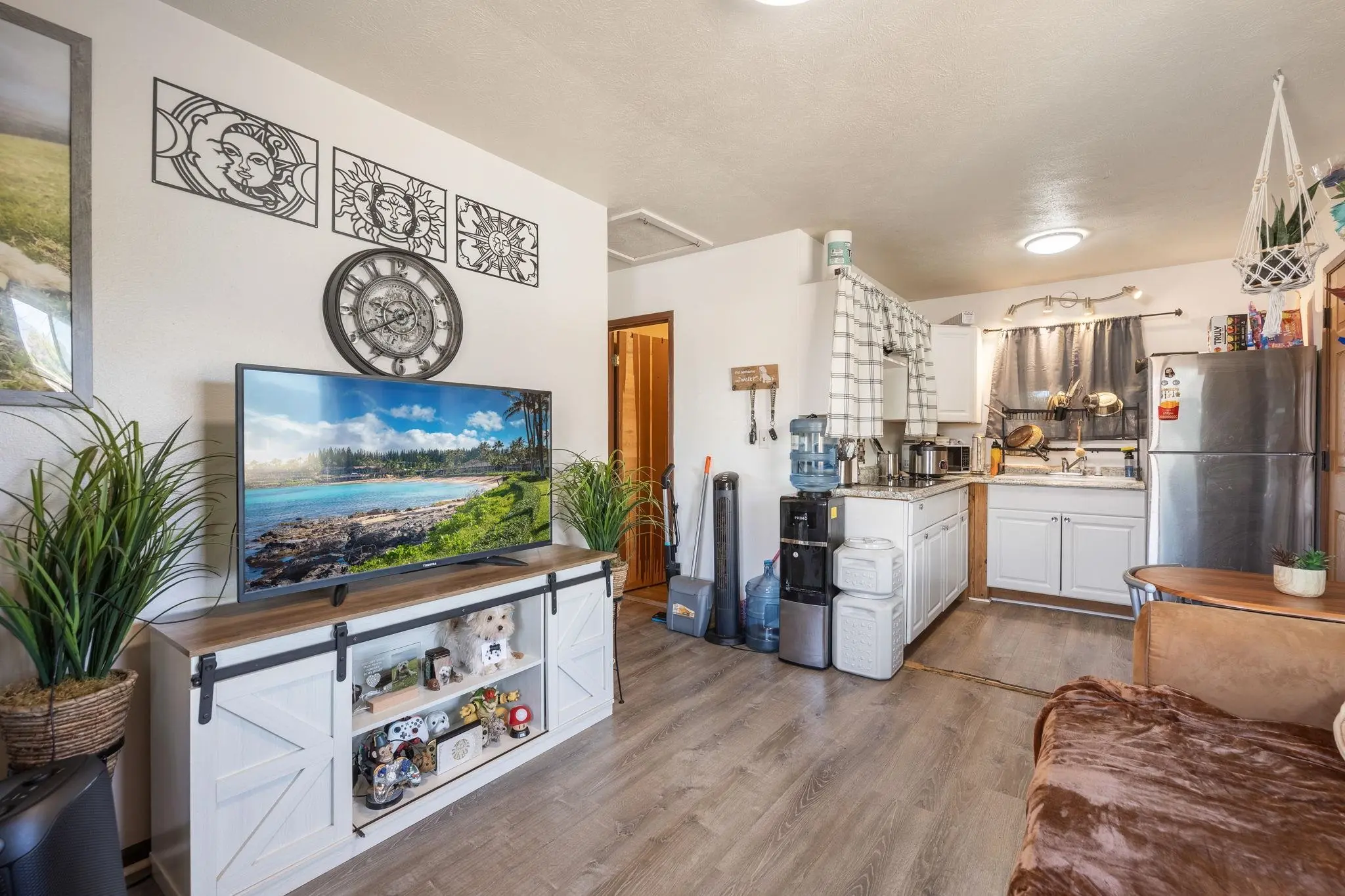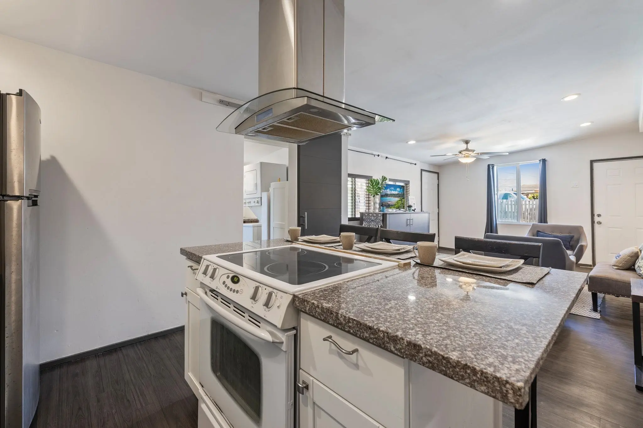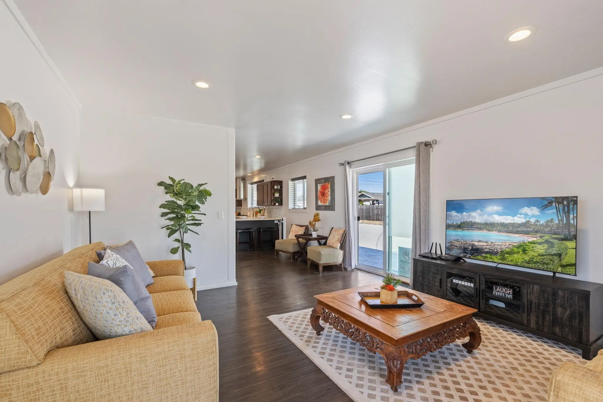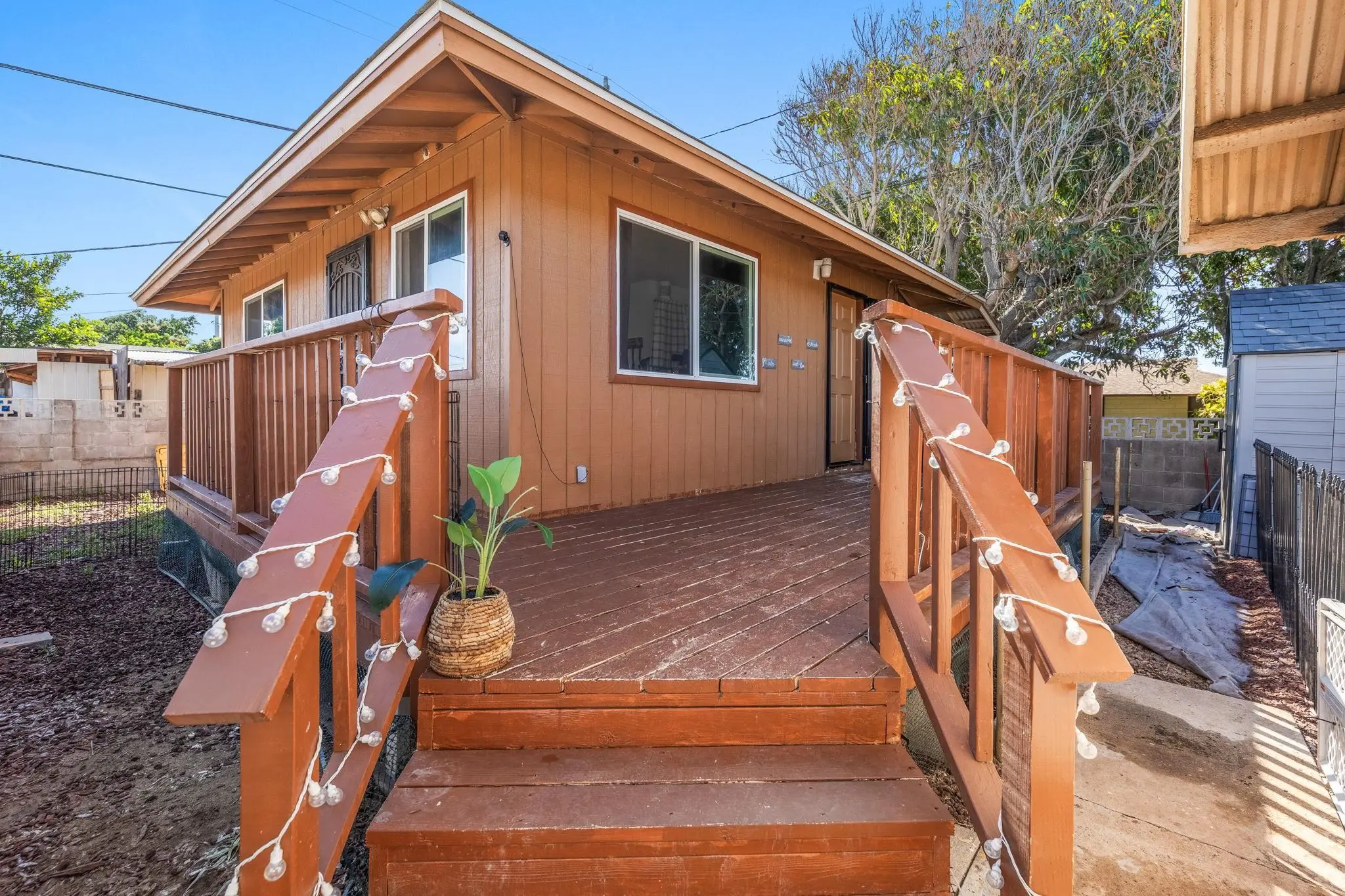 52 Aiai Street is a remodeled, 3 bedroom, 2 bathroom main home and a 2 bedroom, 1 bathroom detached cottage. The main house offers a flexible floor plan that could function as separate living spaces. In the main house, open-concept living and dining areas are ideal for gathering and entertaining. Large windows and modern lighting feel bright and airy, while durable, dark ash flooring offers a stylish contrast. Dual kitchens in the main house offer separate spaces for meal preparation and feature granite countertops, elegant backsplashes, stainless steel appliances and plenty of storage space. Enjoy relaxed dining around the breakfast islands. The main house offers 3 spacious bedrooms and 2 bathrooms with a sleek design, tiled walk-in showers and durable finishes. The 500 square foot detached cottage flows cohesively with the main house design. The cottage includes a cozy front porch, its own yard and storage. Enjoy the outdoor amenities with 3 storage sheds on property, a wide driveway with ample parking space and multiple yards. This property is in a convenient location across the street from the neighborhood park and close to the airport, shopping and dining.