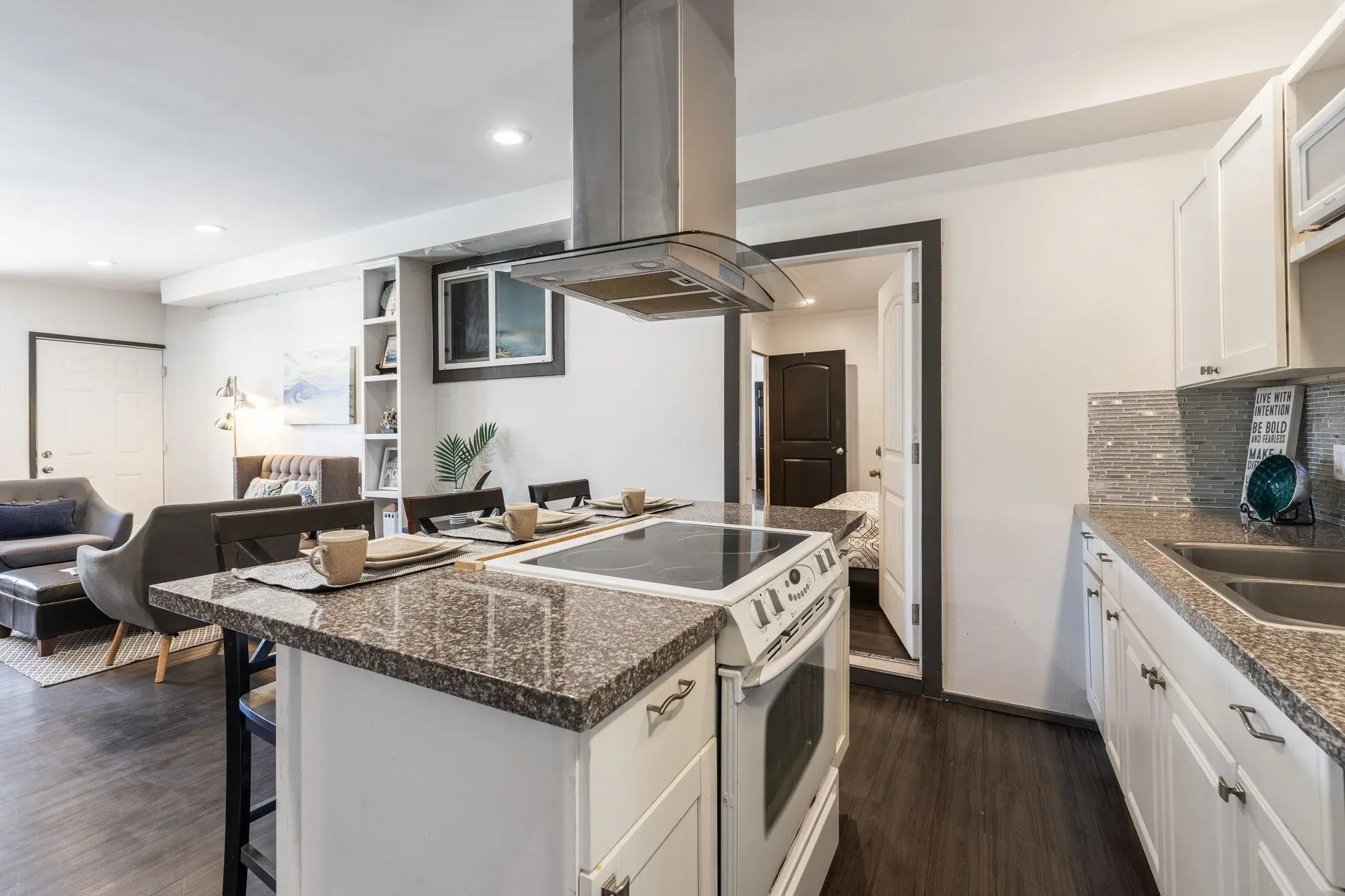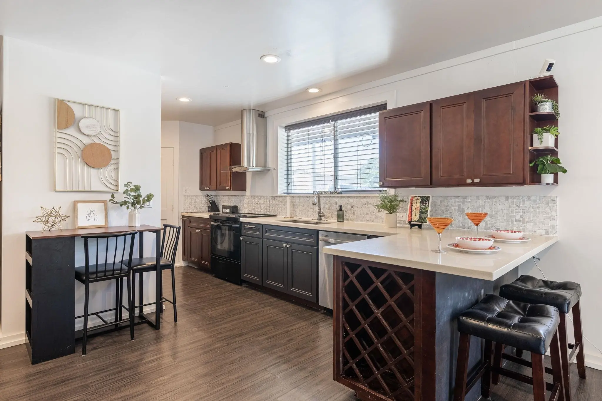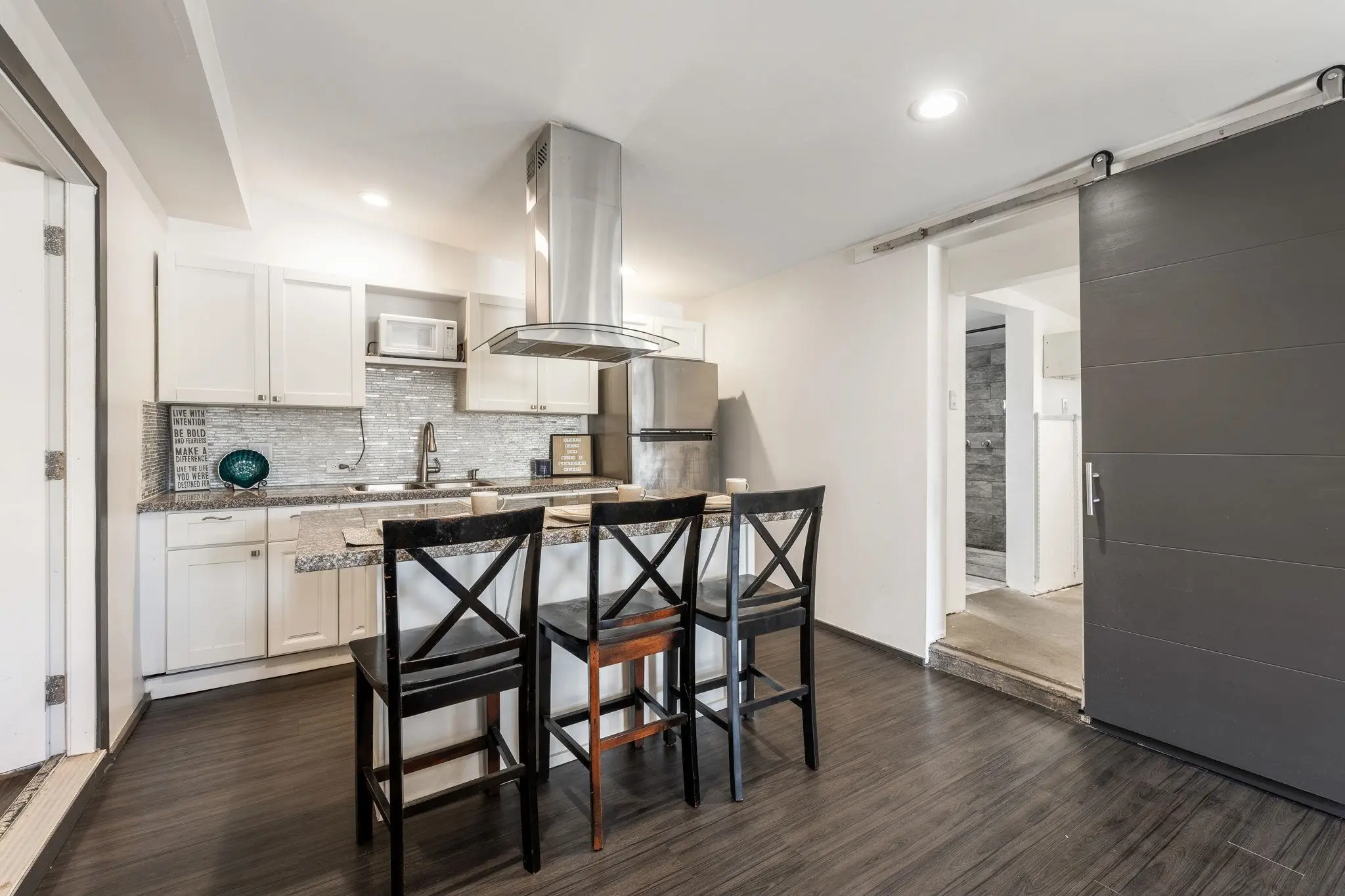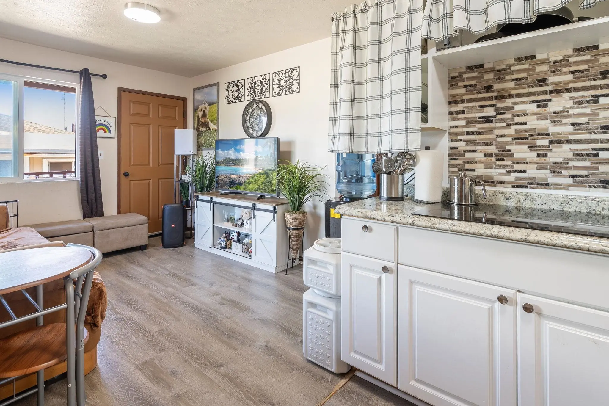 52 Aiai Street is a remodeled, 3 bedroom, 2 bathroom main home and a 2 bedroom, 1 bathroom detached cottage. The main house offers a flexible floor plan that could function as separate living spaces. In the main house, open-concept living and dining areas are ideal for gathering and entertaining. Large windows and modern lighting feel bright and airy, while durable, dark ash flooring offers a stylish contrast. Dual kitchens in the main house offer separate spaces for meal preparation and feature granite countertops, elegant backsplashes, stainless steel appliances and plenty of storage space. Enjoy relaxed dining around the breakfast islands. The main house offers 3 spacious bedrooms and 2 bathrooms with a sleek design, tiled walk-in showers and durable finishes. The 500 square foot detached cottage flows cohesively with the main house design. The cottage includes a cozy front porch, its own yard and storage. Enjoy the outdoor amenities with 3 storage sheds on property, a wide driveway with ample parking space and multiple yards. This property is in a convenient location across the street from the neighborhood park and close to the airport, shopping and dining.