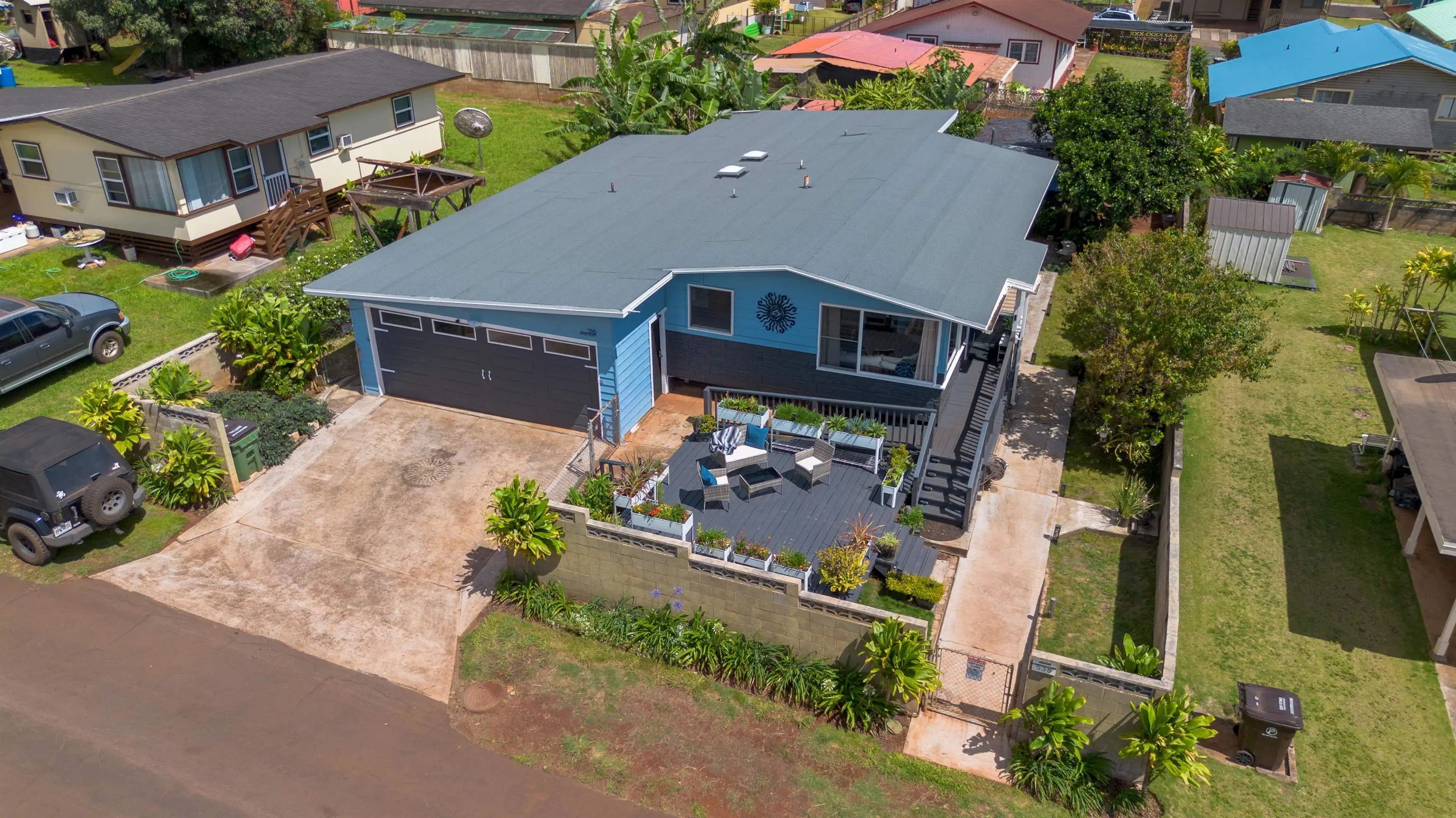 This Lanai gem is a very unique property offering numerous possibilities. A 3 bedroom, 1 bath main house with attached O'hana offering multiple beds, full bathroom, permitted commercial kitchen. Outdoor space is complete with Hawaiian style bar, covered dining patio & numeous fruit trees and flowers. Located on a quiet, dead-end street, there are wonderful sunsets from large front deck looking out to ocean. The main living home has an open floor plan, large windows with lots of light. Front deck surrounds the front entrance to home and is very welcoming. Deck offers raised garden beds for vegetables, herbs and flowers. The two car garage is a bonus for Lanai homes. New roof, interior flooring and paint in 2024/2025. Offerred furnished with a few exceptions. Whether you can use a commercial kitchen or lease it out, this is a real find on Lanai. Don't hesitate, schedule a showing with your favorite realtor soon!