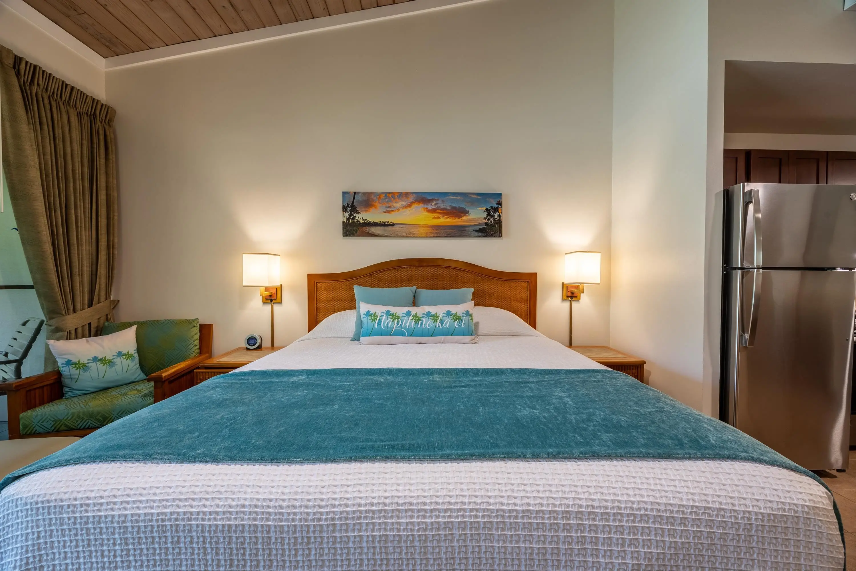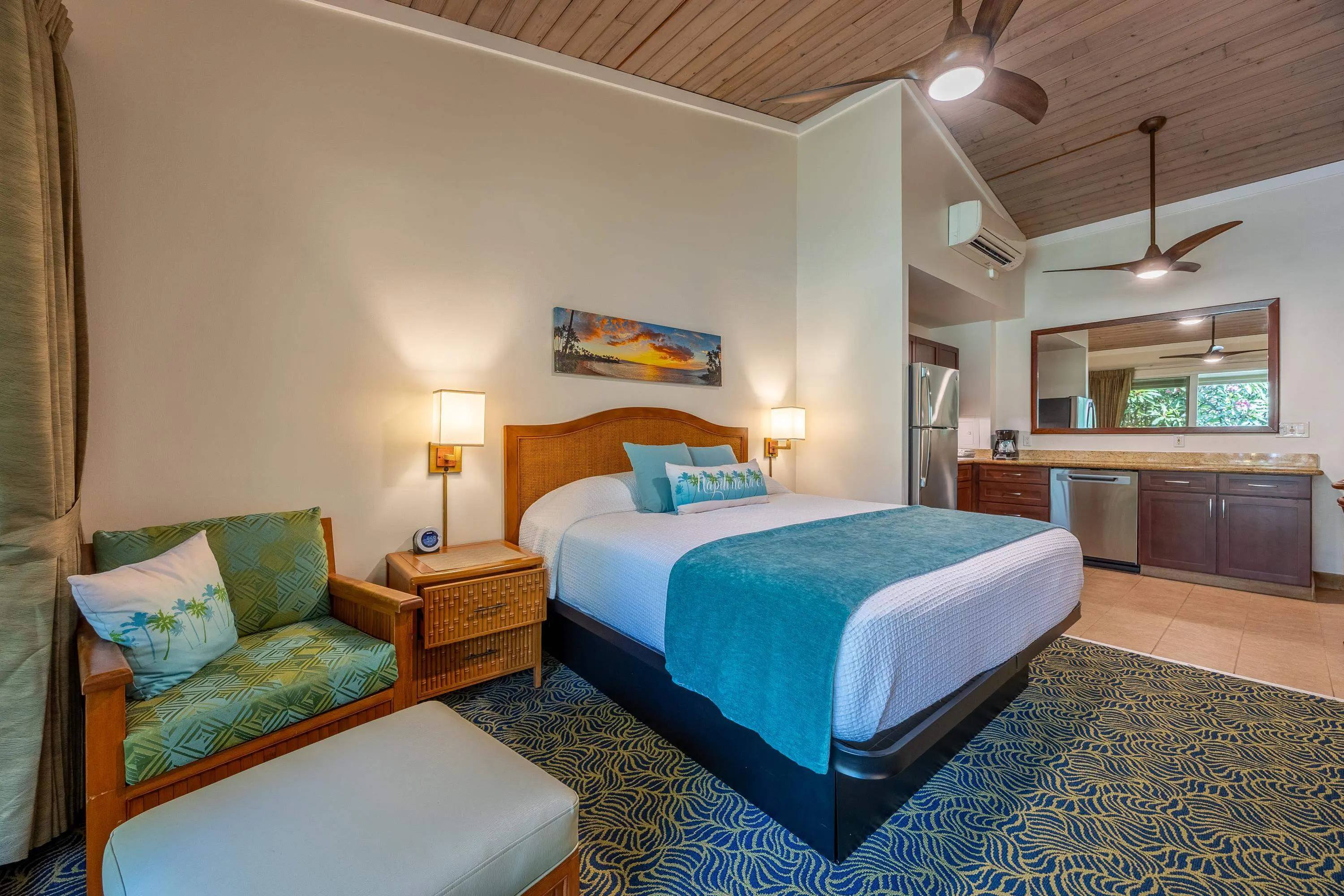 Welcome to Napili Shores D224 — a top-floor garden studio with direct access to the golden sands of Napili Bay. This inviting unit features soaring vaulted ceilings, tile flooring throughout, and an oversized lanai that opens to lush tropical landscaping. The kitchen is finished with granite countertops, and the unit offers two convenient storage areas. Comfort is ensured year-round with a split A/C system and ceiling fans in both the main living area and bathroom. D224 is part of the Outrigger rental program and boasts a solid history as a successful vacation rental. Built in 1973, Napili Shores spans 6.3 acres of manicured grounds and offers resort-style amenities including two swimming pools, a spa, BBQ areas, shuffleboard, and two beloved on-site restaurants: The Gazebo and Kitchen 5315. Additional conveniences include a surf shop and close proximity to Honokeana Cove, Kapalua, and Napili Plaza with its shops and dining options. Zoned NBCID, Napili Shores is perfect as a personal retreat or an income-producing vacation rental. Contact your Realtor today to arrange a private showing!