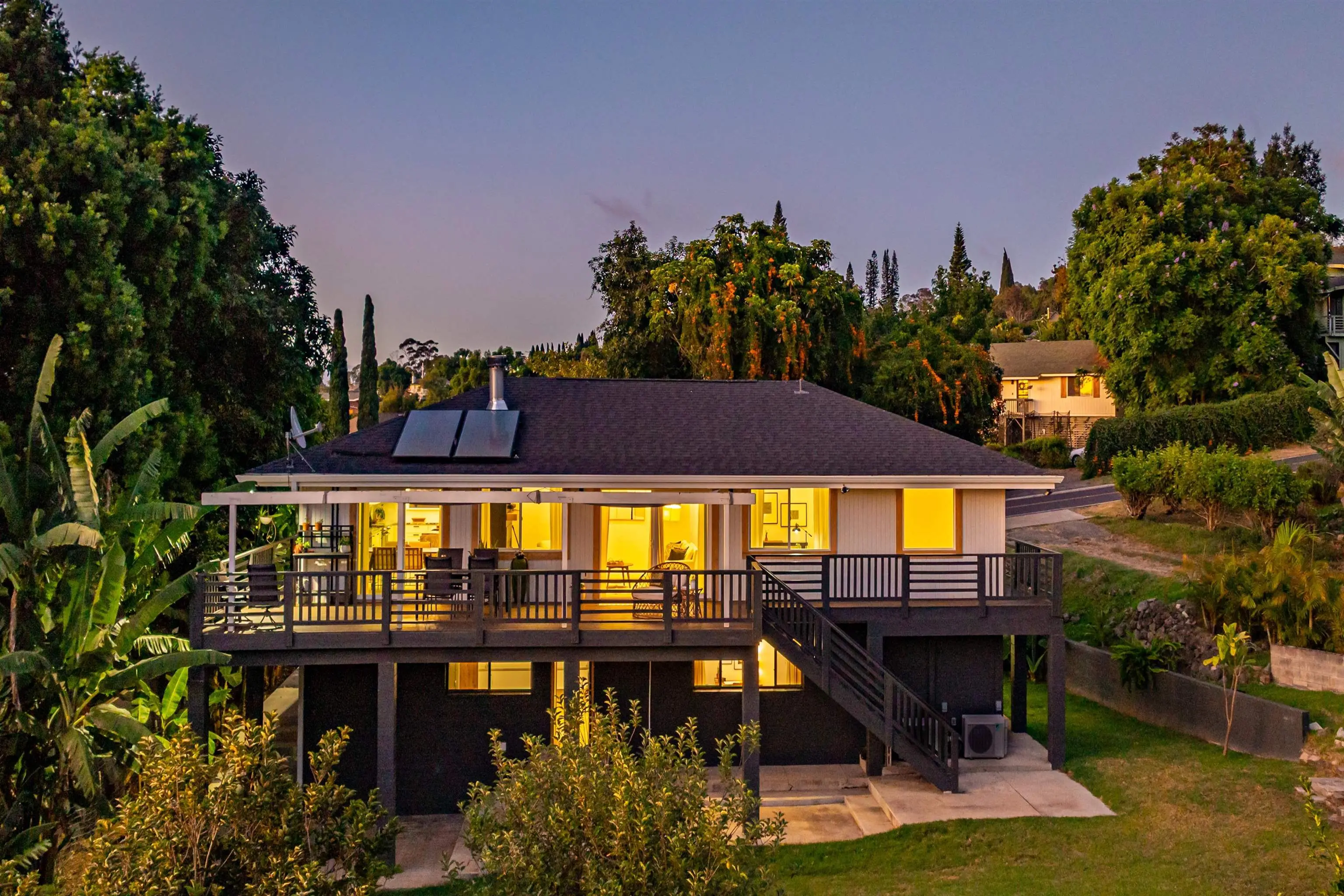 Set in the peaceful Kula Orchards neighborhood, this welcoming Upcountry home offers space, style, and functionality for modern island living. Located at approximately 3,000 ft. elevation on a 7,707 sq ft lot, the two-story residence was extensively updated in 2021 and remains in excellent condition — perfect for those seeking comfort and convenience. The kitchen is thoughtfully designed for both cooking and gathering, featuring sleek stainless-steel appliances, stone countertops, and ample cabinetry. A custom beverage station adds charm and versatility — ideal for stocking all your favorite beverages. The living/dining rooms flow to the large outdoor deck by way of two sliding glass doors. Meals can be enjoyed indoors or outdoors on the deck, the perfect place to enjoy soft Haleakala sunrises and sunset ocean views. Vinyl plank flooring extends throughout the home, complemented by central AC upstairs and a split AC system downstairs, updated dual-pane windows, 5 yr old roof, updated bathrooms and newly painted interior. Additionally, the home is wired for smart tech, lighting, and sound. Outdoor enhancements include a widened driveway and French drain. With its practical upgrades, inviting layout and a quiet Upcountry backdrop, this home is ideal for those craving space and serenity in a beautiful part of Maui.