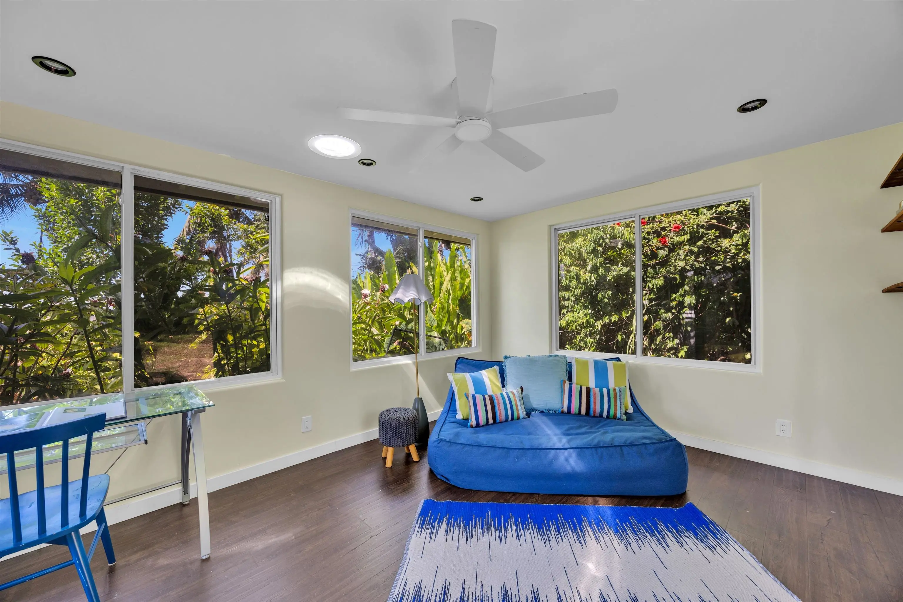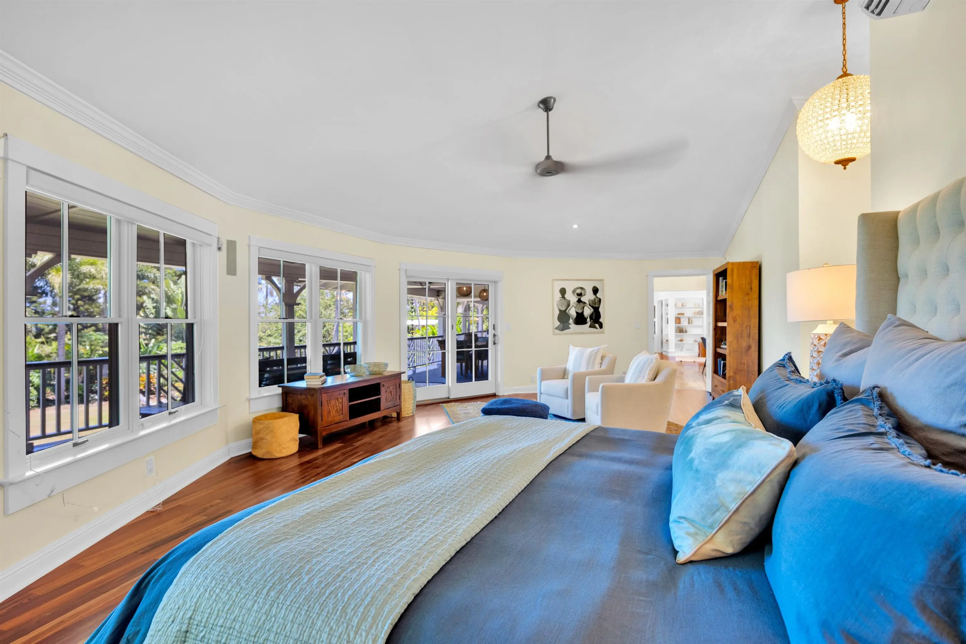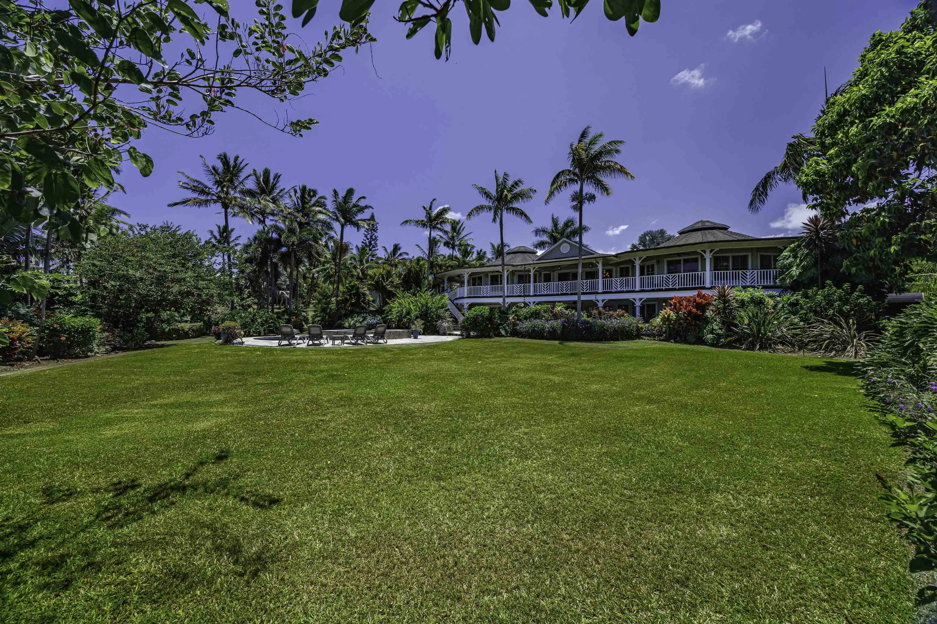 Immaculately maintained 5-bedroom, 6-bath estate with over 5,000 sq. ft. of living on two fully fenced, gated acres designed for connection, retreat, and effortless indoor-outdoor living. The inviting floor plan welcomes friends and family, anchored by a chef’s kitchen built for hosting with a custom island and butler’s pantry opening to covered lanais. Resort-style amenities include a saline pool and jacuzzi, sauna, and cold plunge. The land is lush and productive, featuring raised garden beds, an abundance of fruit and citrus trees ideal for sharing or selling, plus lei flowers, puakenikeni and plumeria, and a thriving ginger and banana patch that fill the property with color and fragrance. All bedrooms are en-suite, including a private guest suite. Energy efficiency is addressed with a 52-panel PV system, solar hot water, split AC, and whole-house backup generator. One detached workshop with tools, and a second air-conditioned art or yoga studio with sink, a large bonus room above the garage, peek-a-boo ocean views, and extensive furnishings complete this rare lifestyle offering.