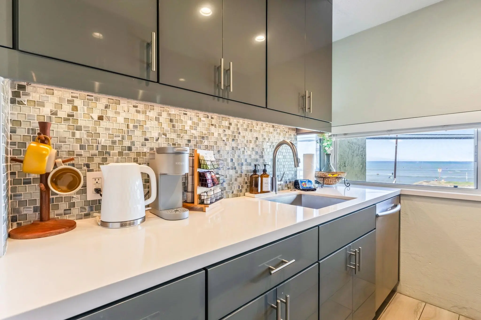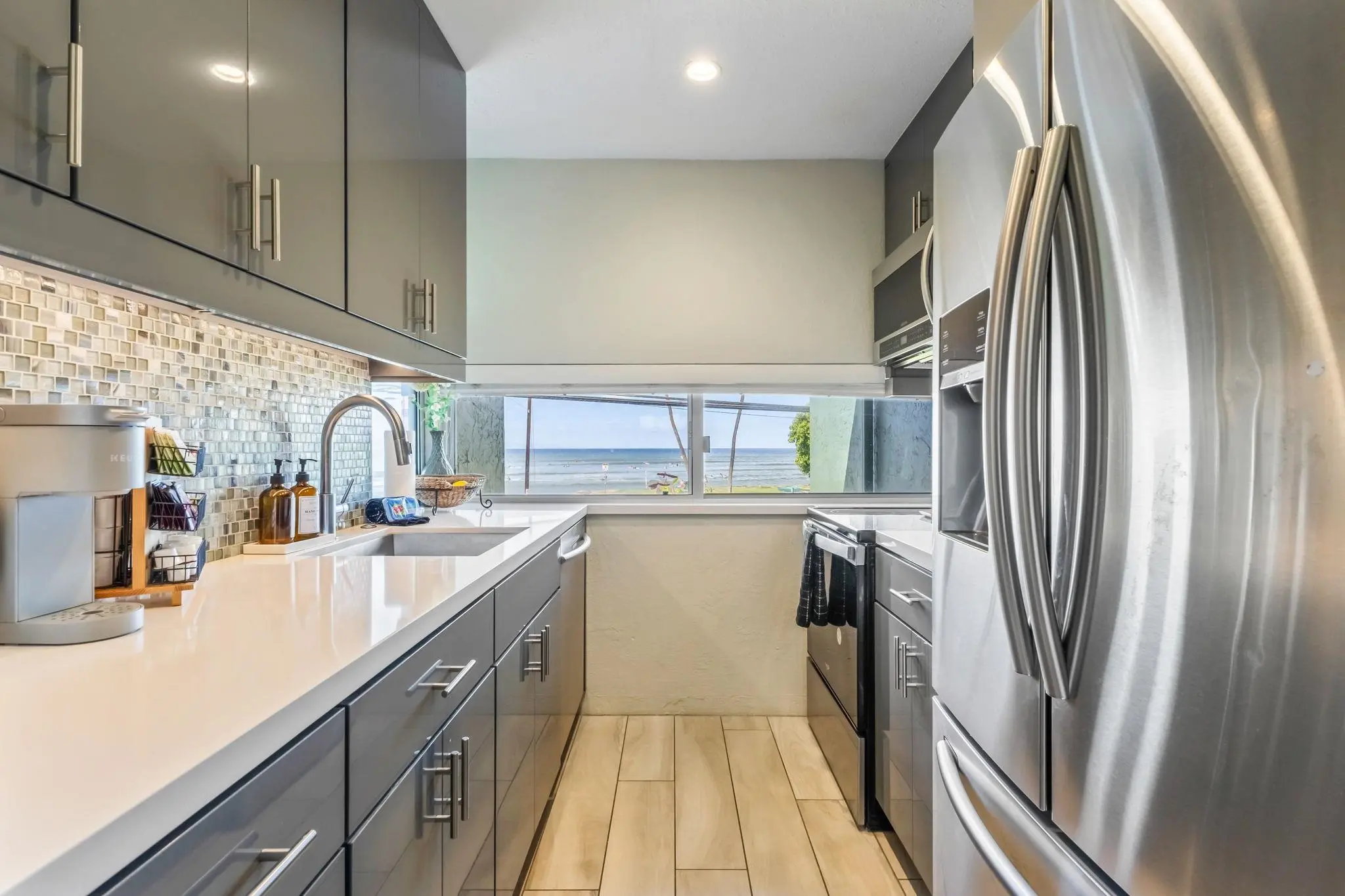 Averaging $300-$1000/night as a rental! Across from the Cove Beach surf! HIDDEN GEM and with QUALITY designer finishings, Corner 2 BED + 2 BATH Single Level unit with OCEAN VIEWS, daily sunsets, surfers, paddlers and seasonal whales as your backdrop. Inside, vaulted ceilings and wide-plank tile floors create a bright, beach-luxe feel. CENTRAL A/C, Fleetwood Sliders/E-glass windows, remodeled baths with floating vanities + jetted tub, and a custom kitchen with Craft-Maid cabinetry and Caesarstone counters. Full-size washer/dryer, Lutron lighting, and attic space add to the comfort. Sold Furnished and Move-in Ready. Kihei Park Shore is a boutique 16-unit complex just steps to Kamaole Beach Parks, shops and South Maui Gardens. One of the best-priced fee simple, vacation-rentable 2bd/2ba condo in Kihei. Active Short Term (STR) Rental. Your Maui lifestyle awaits! One seller held a Real Estate License out of State.