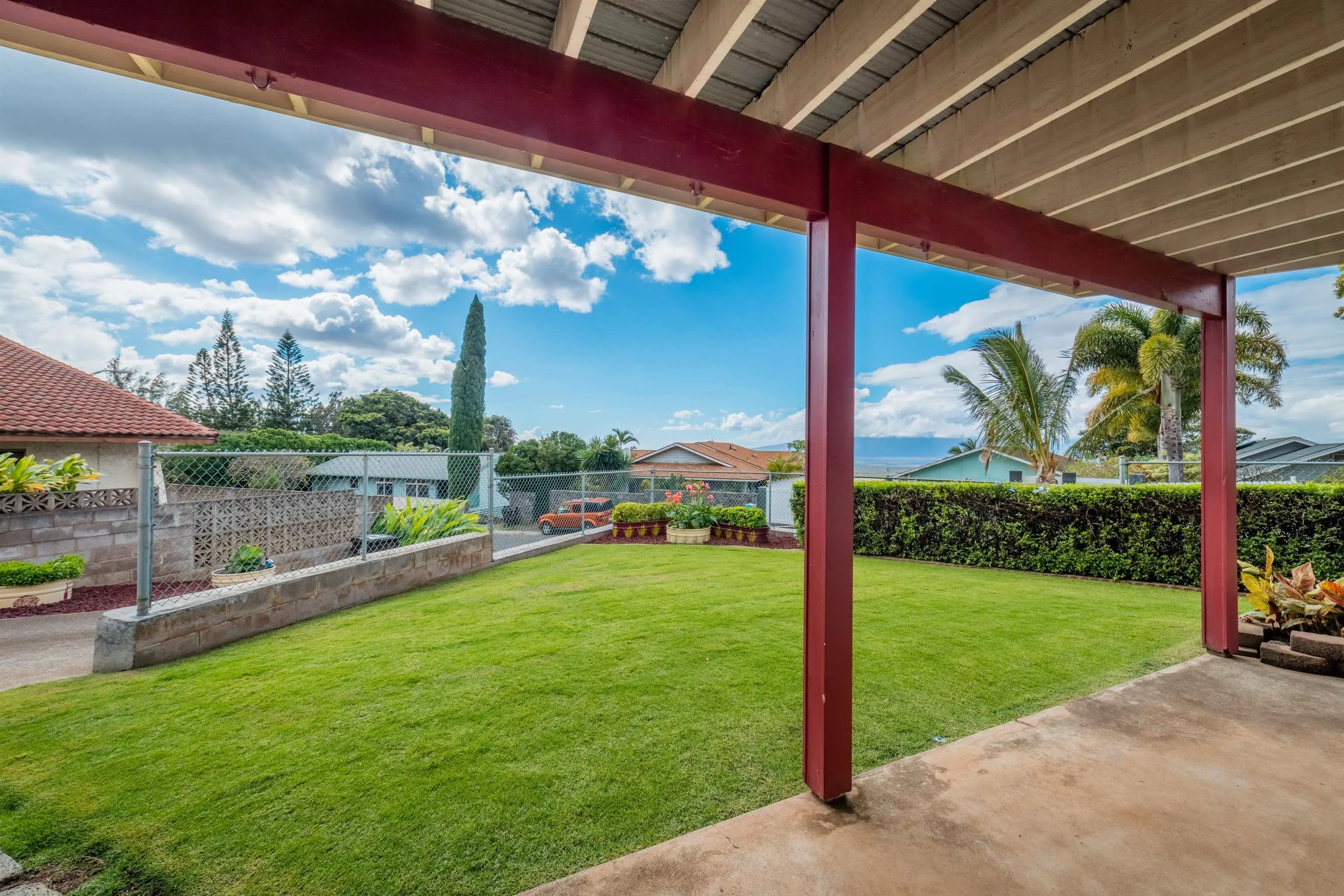 Find 2679 Kamelani Loop a naturally bright and inviting home, impeccably situated on a minimal traffic corner lot. From the moment you arrive, the tastefully manicured lawn and garden enhance the home's curb appeal, setting the stage for a meticulously cared for home. The Trex-decked balcony offers a stunning view of the West Maui Mountains, Maalaea, and South Maui, providing a serene backdrop for morning coffee or colorful evening sunsets. The property is mostly fenced, offering privacy while showcasing its lush landscaping with irrigation for easy care. Garden includes tropical blooms such as Bird of Paradise, Ginger, and Ti Leaf. Inside, you'll appreciate the thoughtful upgrades, including custom window shutters, upgraded light fixtures & ceiling fans, and a 3-unit split A/C system to ensure year-round comfort. The sunken living space with vaulted ceilings is welcoming and functional, perfect for relaxing or entertaining. The attached bonus ohana includes a finished 1-bedroom, 1-bathroom unit with private entry. Whether for hosting family, exploring rental opportunities, multi-family arrangements, or creating a personal retreat, this space adds incredible versatility and value with a fully functional kitchen, walk in shower, 2 split A/C units, and large comfortable living spaces. The main home and ohana are separated by a charming, oversized barn door for added privacy. This allows full use of the home as one unit or as a completely separate living space. Don't miss this rare opportunity to find a truly enjoyable Maui home.
