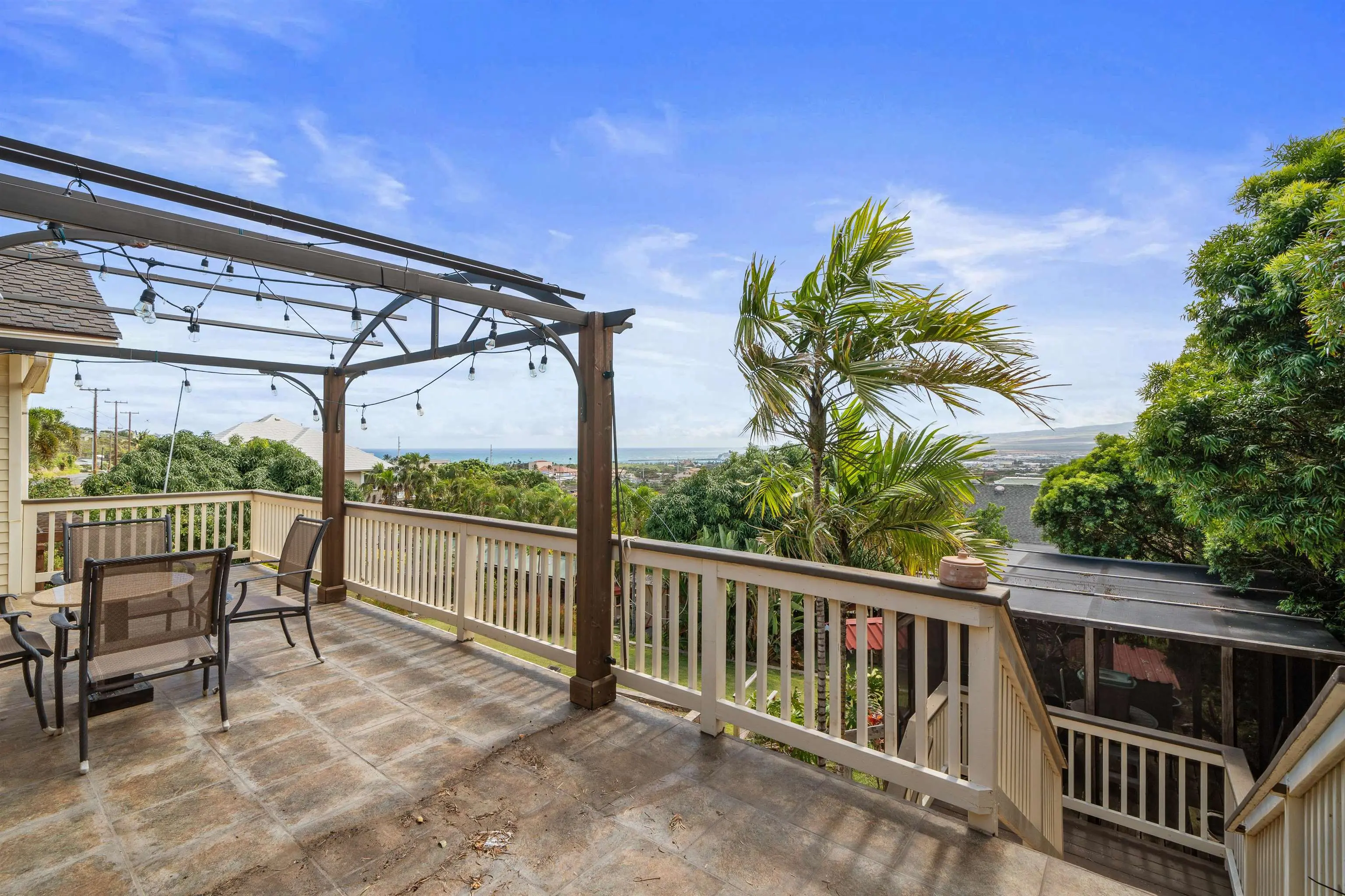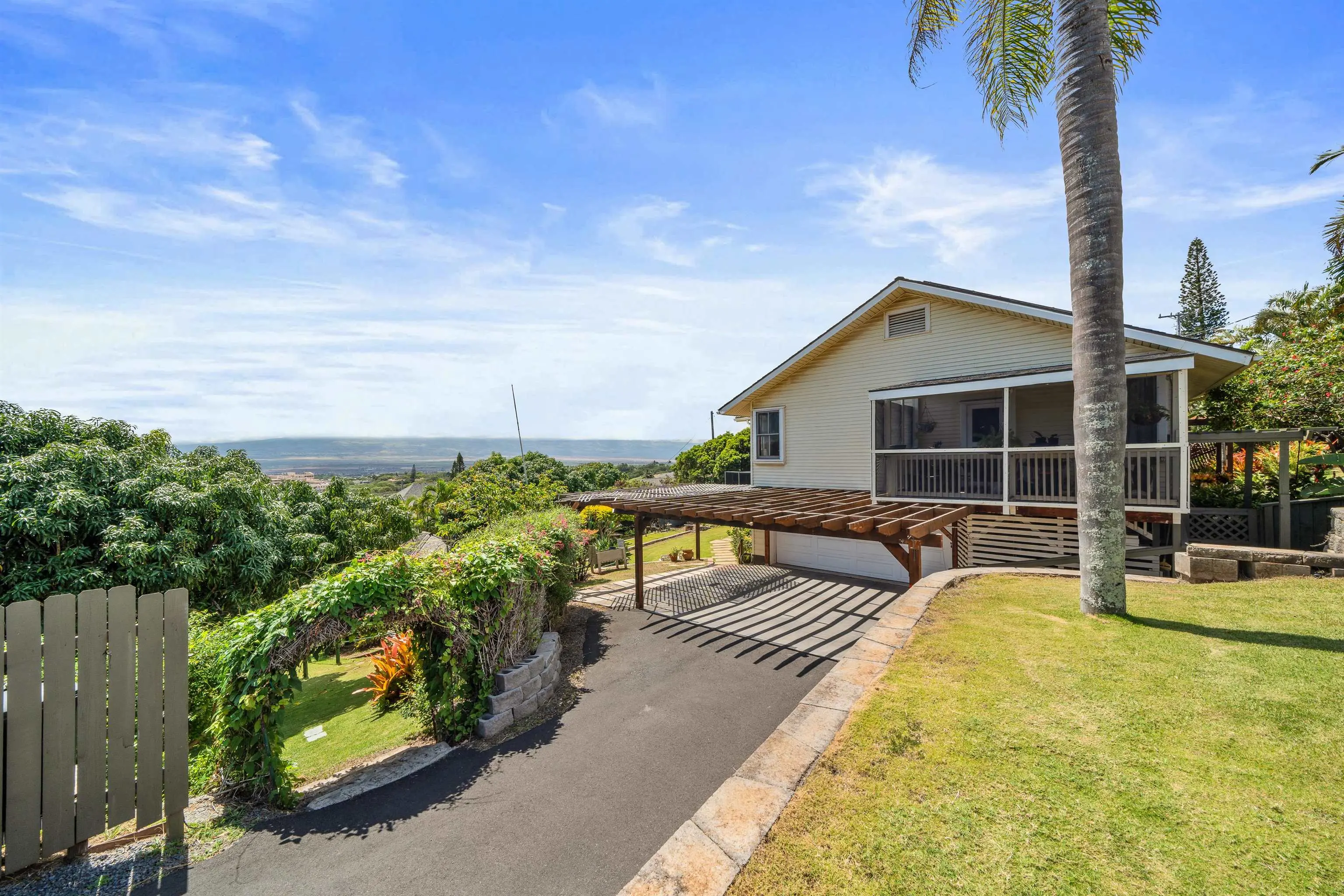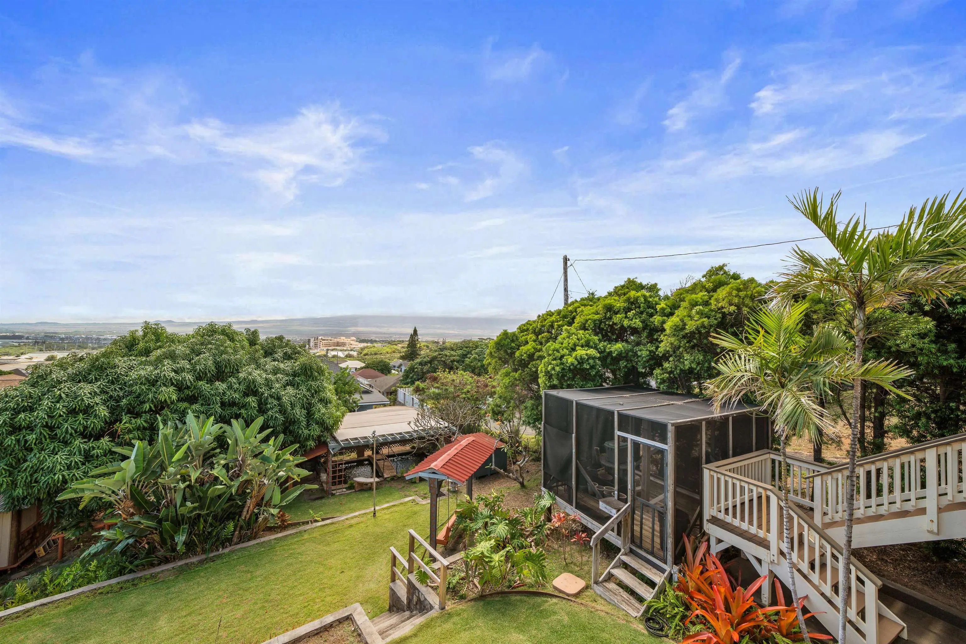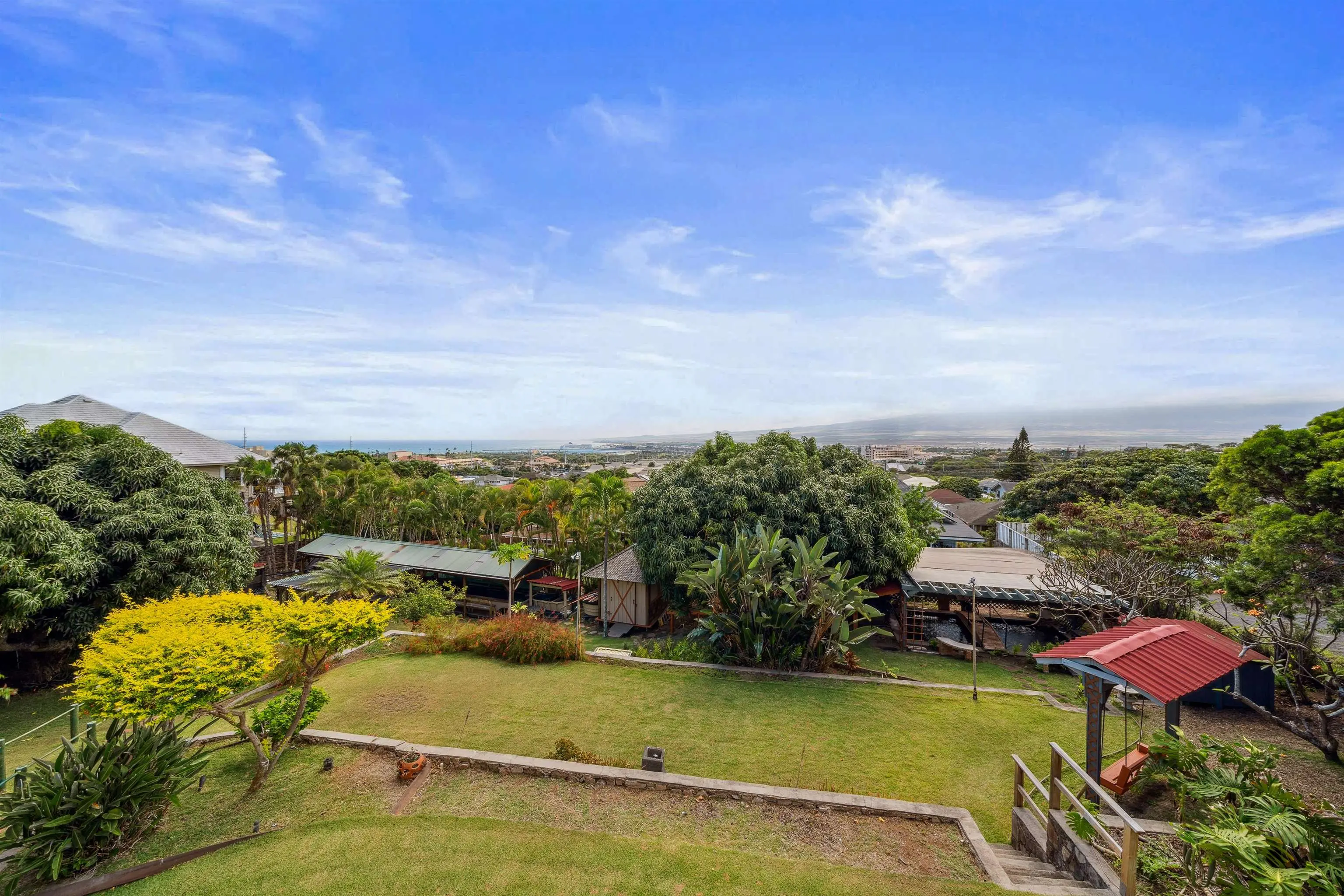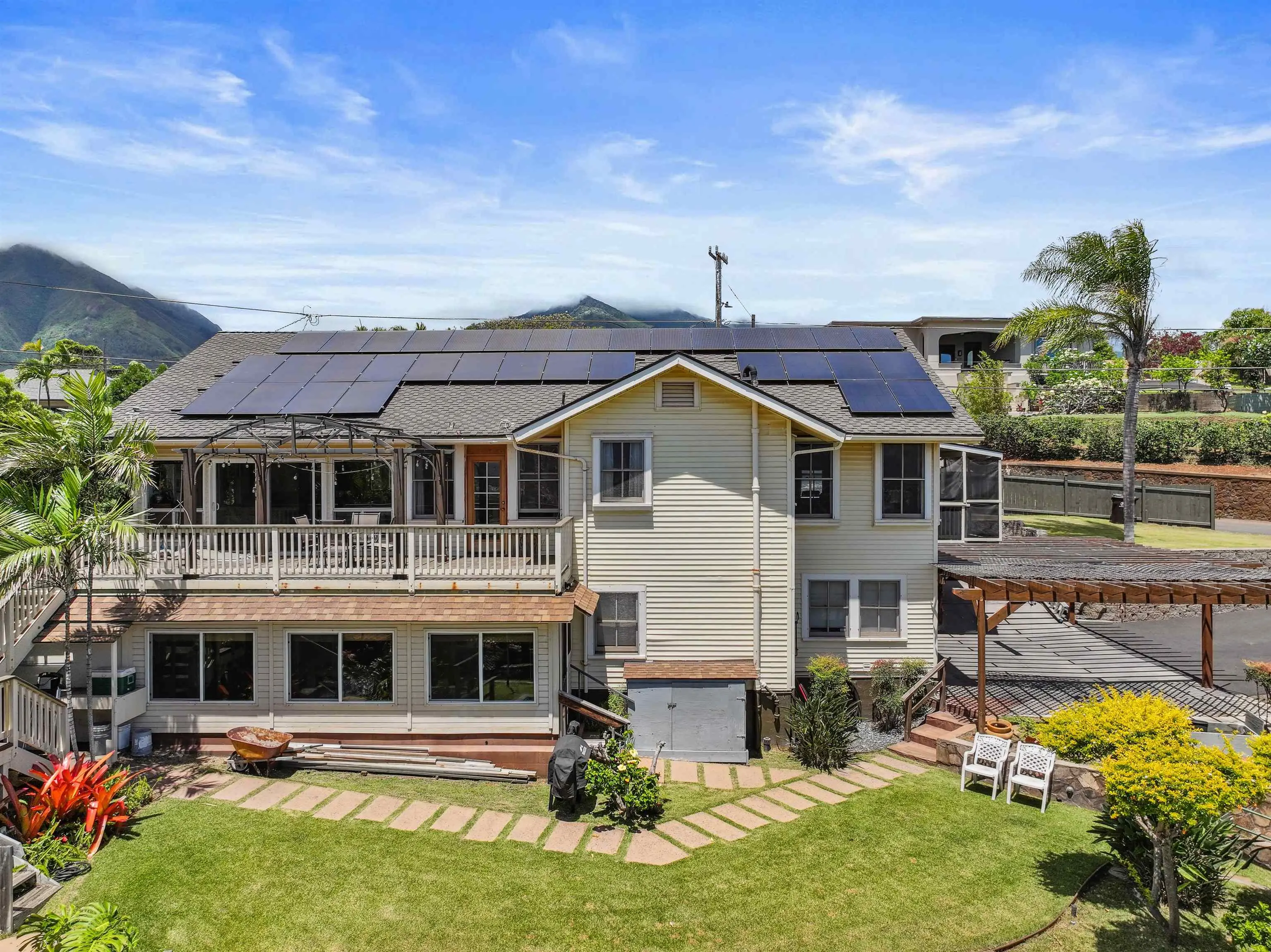 Charming “Plantation Style” home situated on a fully landscaped ½ acre lot with views galore! The current R-3 zoning offers potential. The property has a Photovoltaic system consisting of 55 panels and is owner owned. You will appreciate the ocean, mountain and harbor views. The open living room leads out onto the upstairs patio and the stairway takes you down to the 1st story family room, kitchenette and enclosed patio. The kitchen is bright with white cabinets and Quartz counter tops with 2 sinks. Other Features include: glass door knobs, crown molding, wood hung windows, and Split AC units built in cabinets with glass doors & a cozy breakfast nook and a comfortable dining room. The seller will be leaving some furniture items. The seller had the house tented for termites and the warranty will be provided to the buyer at closing. There’s a Koi fish pond that is no longer being used. But, materials are there if you’d like to raise Koi again. This wonderful property is conveniently located in Wailuku near schools, churches, hospital, restaurants, shopping, and the MACC. Property is being sold in As-Is condition to qualified buyers. Two days notice to show.Thanks!