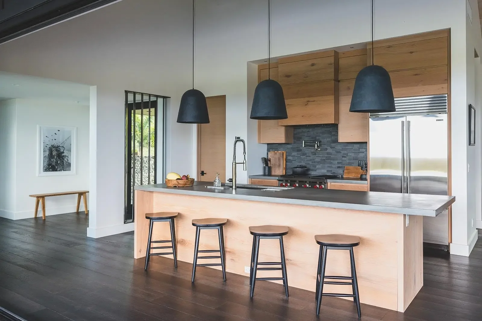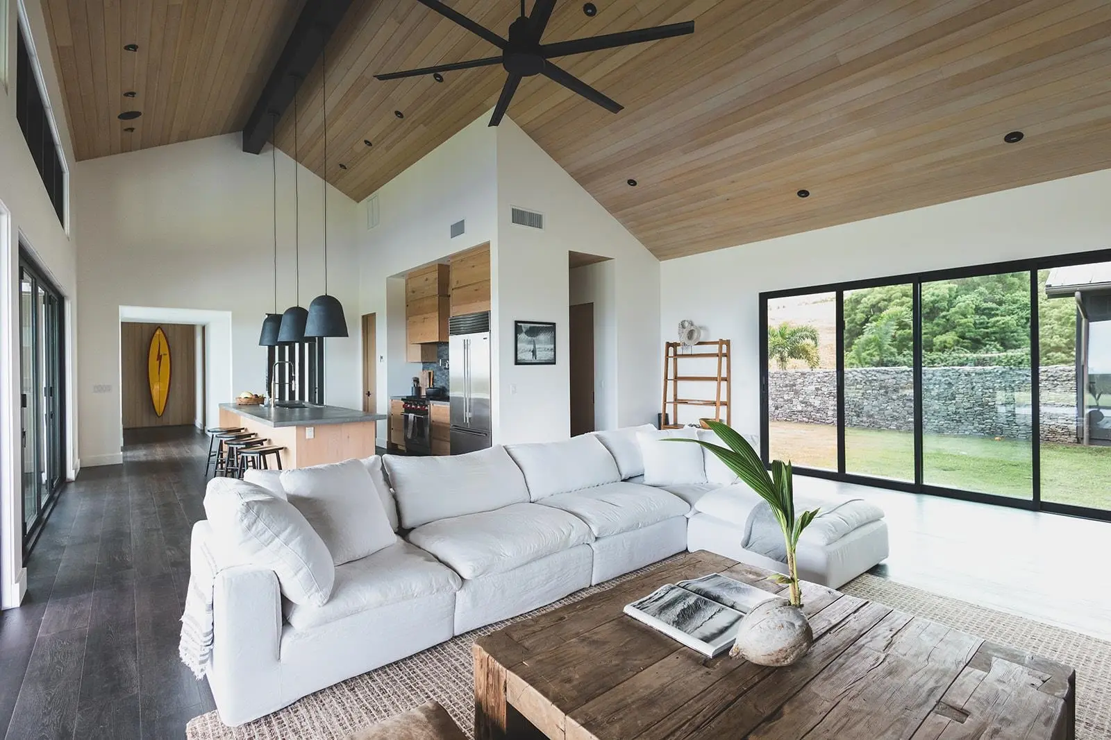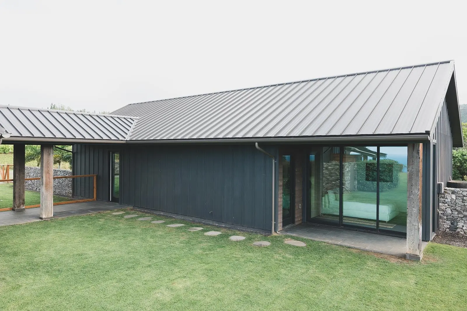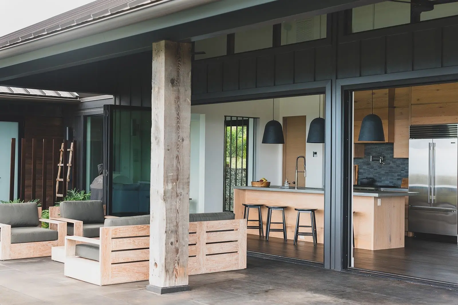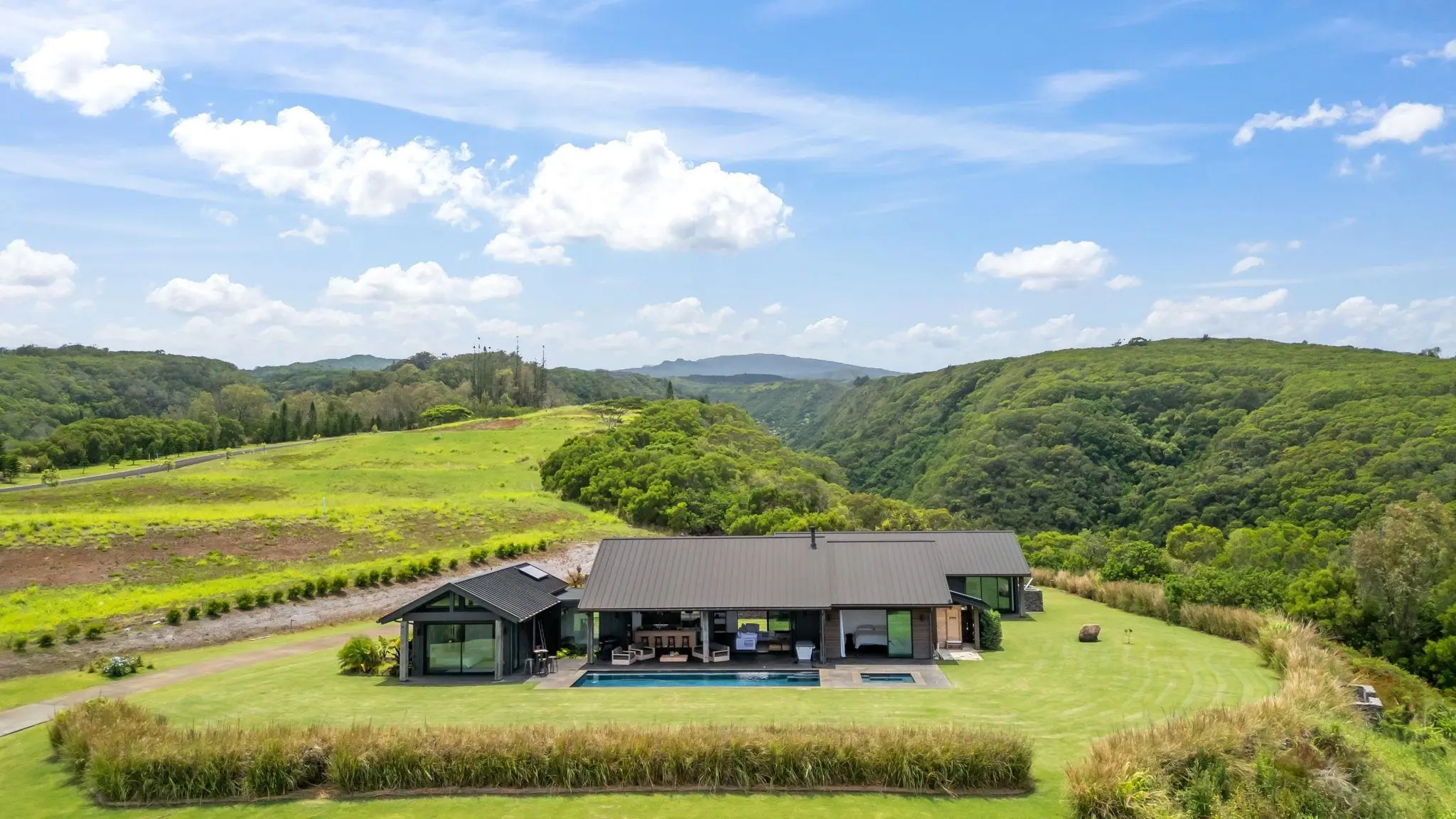 Nestled on over two acres in the coveted Mahana Estates at Kapalua, this 2022 custom-built modern masterpiece redefines island luxury. Its sleek, dark exterior and expansive glass walls harmonize effortlessly with Maui’s lush landscapes and breathtaking ocean views. Inside, soaring wood ceilings and rich hardwood floors create a warm yet refined ambiance, while the open-concept design invites seamless indoor-outdoor living. The gourmet kitchen dazzles with top-tier appliances and a sprawling island perfect for entertaining. Accordion glass doors blur the line between the interior and the stunning surroundings, offering panoramic vistas of Molokai and verdant valleys. The primary suite is a tranquil haven, opening directly to the pool and thoughtfully designed to capture Maui’s serene energy.