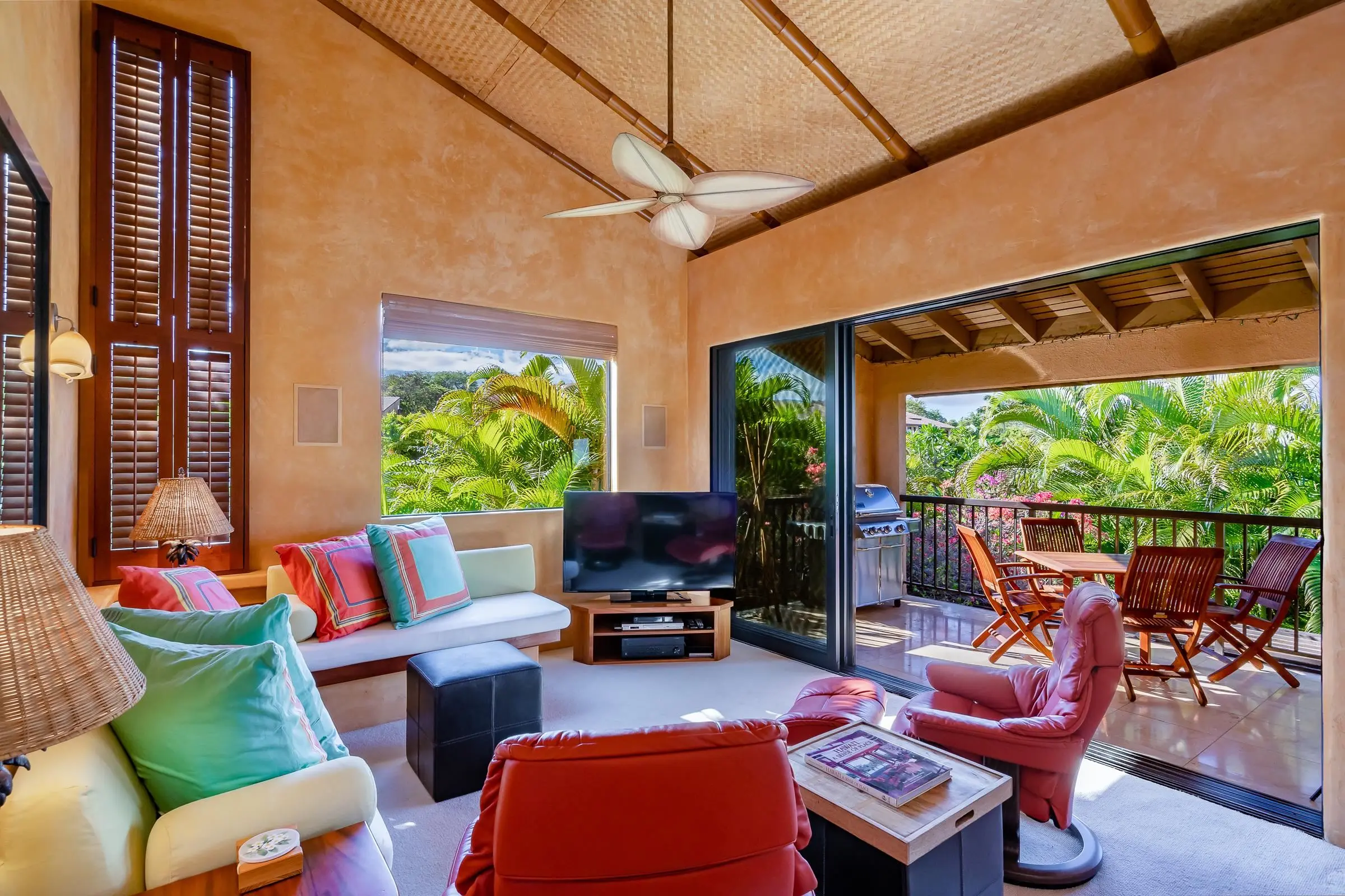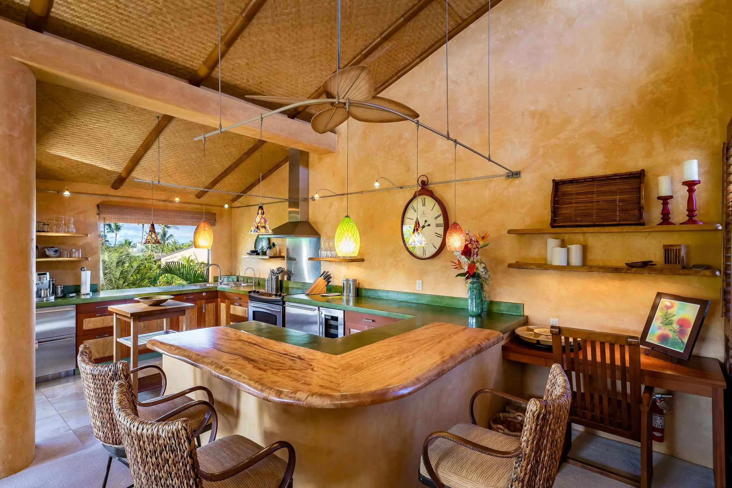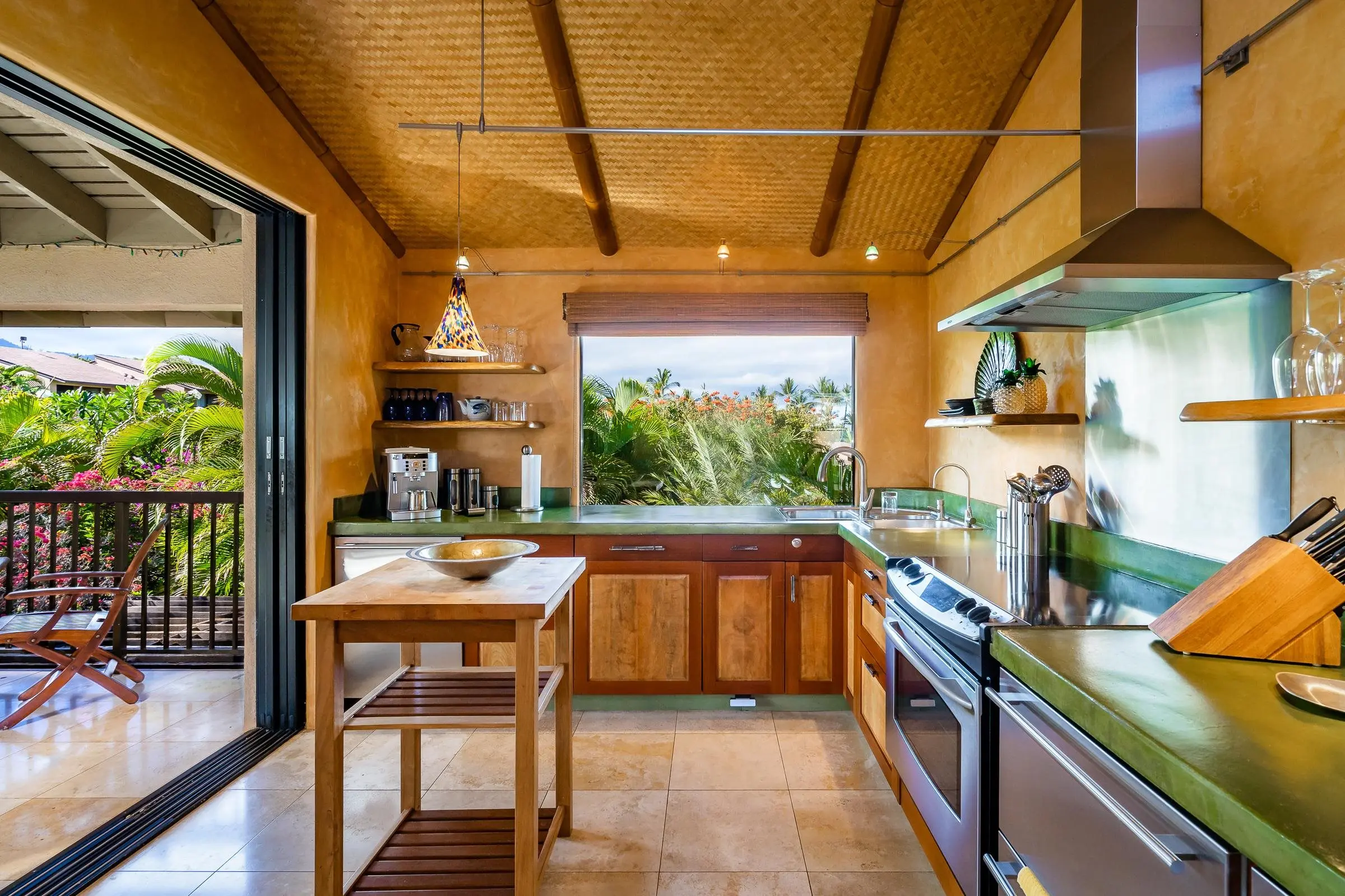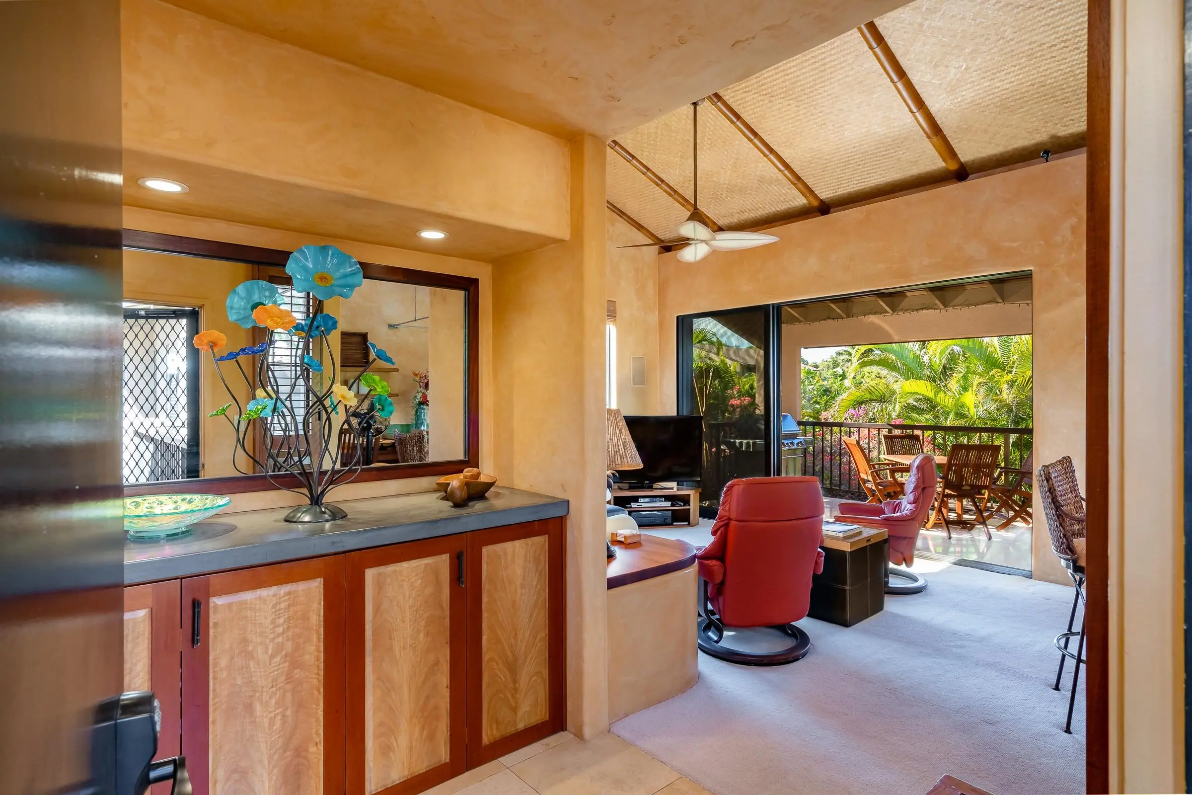 An exceptional co-ownership opportunity awaits in one of the finest & most beautifully renovated units in Wailea Ekahi Village. This fully furnished, turnkey upstairs corner residence is a proven vacation rental and a true architectural standout, thoughtfully redesigned with a rich, sophisticated Balinese-inspired aesthetic. Vaulted ceilings soar overhead, finished in natural lauhala and accented with bamboo beams, while walls are wrapped in luxurious velvet-textured Italian plaster. Flooring transitions seamlessly between travertine, edge-grained bamboo, and plush carpet, creating warmth & elegance throughout. Indoor and outdoor living blend effortlessly as Fleetwood stacking doors open to an ocean-view lanai. Whether relaxing with morning coffee or watching the sun set, this setting is pure Wailea. For warmer afternoons, a new dual split-system air conditioning provides comfort throughout the living space, which also features a custom built-in sofa with mahogany-trimmed end tables, a flat-screen TV, Bluetooth stereo, and in-wall speakers. Expansive custom windows capture ocean & mountain views while filling the condo with natural light. The chef’s kitchen is both artistic and highly functional, featuring hand-cast colored concrete countertops, custom book-matched mango and mahogany cabinetry with oil-rubbed bronze hardware, and mango wood-paneled stainless appliances. A Franke sink with Seagull water purification system complements under-counter refrigeration, including Sub-Zero refrigerator and freezer drawers with ice maker and a Perlick commercial-grade stainless beverage center. The kitchen bar is topped with exotic tropical mango wood and illuminated by colorful halogen pendant lighting — perfect for entertaining or casual island dining. The primary bedroom mirrors the home’s architectural beauty, with vaulted lauhala and bamboo ceilings and peaceful east-facing Haleakala views filtered through handcrafted mahogany shutters. The spa-inspired ensuite bath features dual hand-cast glass vessel sinks, a custom textured glass shower enclosure, and elegant built-in storage. Recessed halogen art lighting and a side-by-side washer and dryer complete this thoughtfully designed interior. This is a rare opportunity to enjoy luxury Wailea living at a fraction of the cost, with ownership in one of Ekahi’s most distinctive and desirable residences — ideal for personal use, rental income, or both.