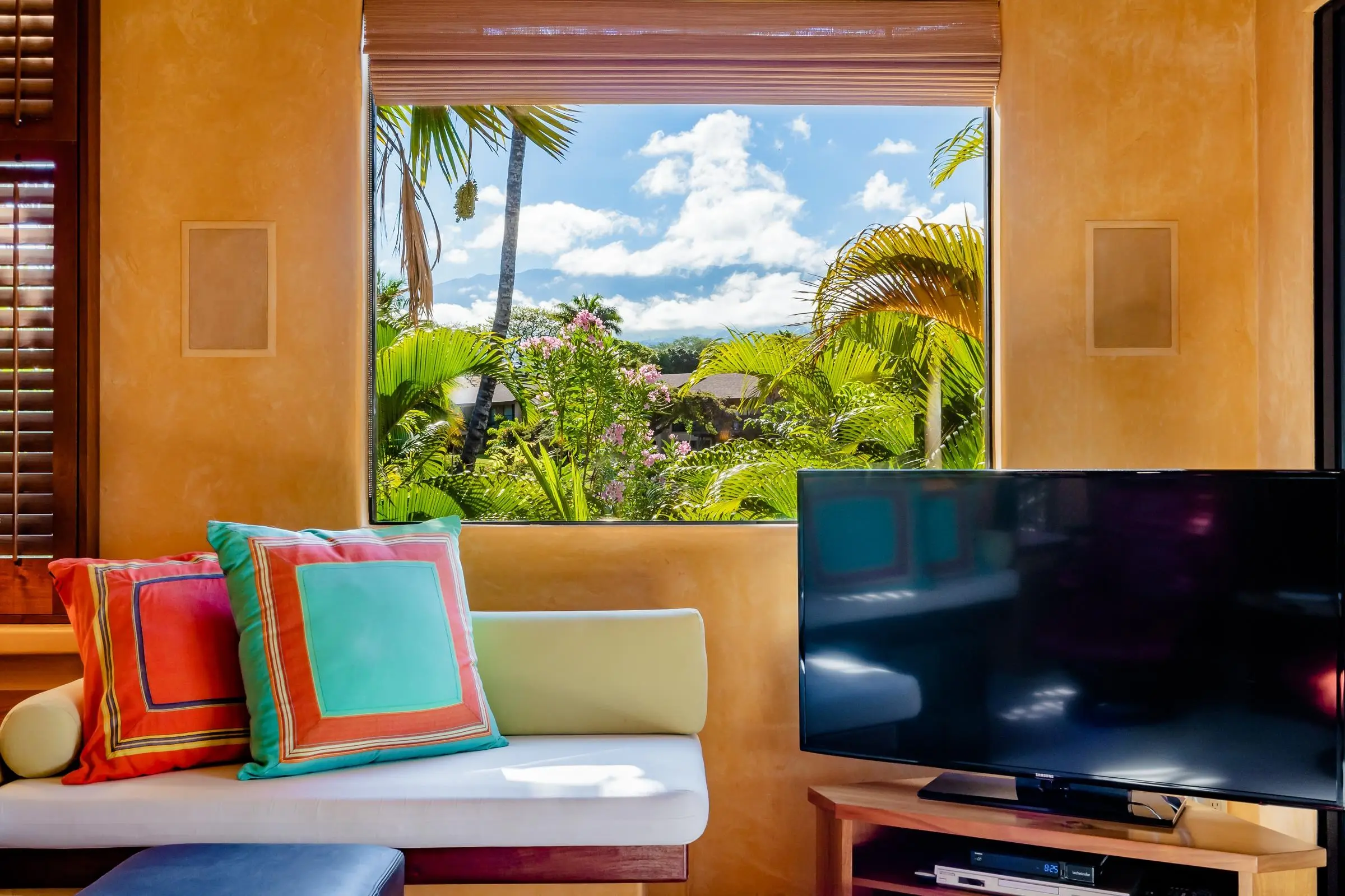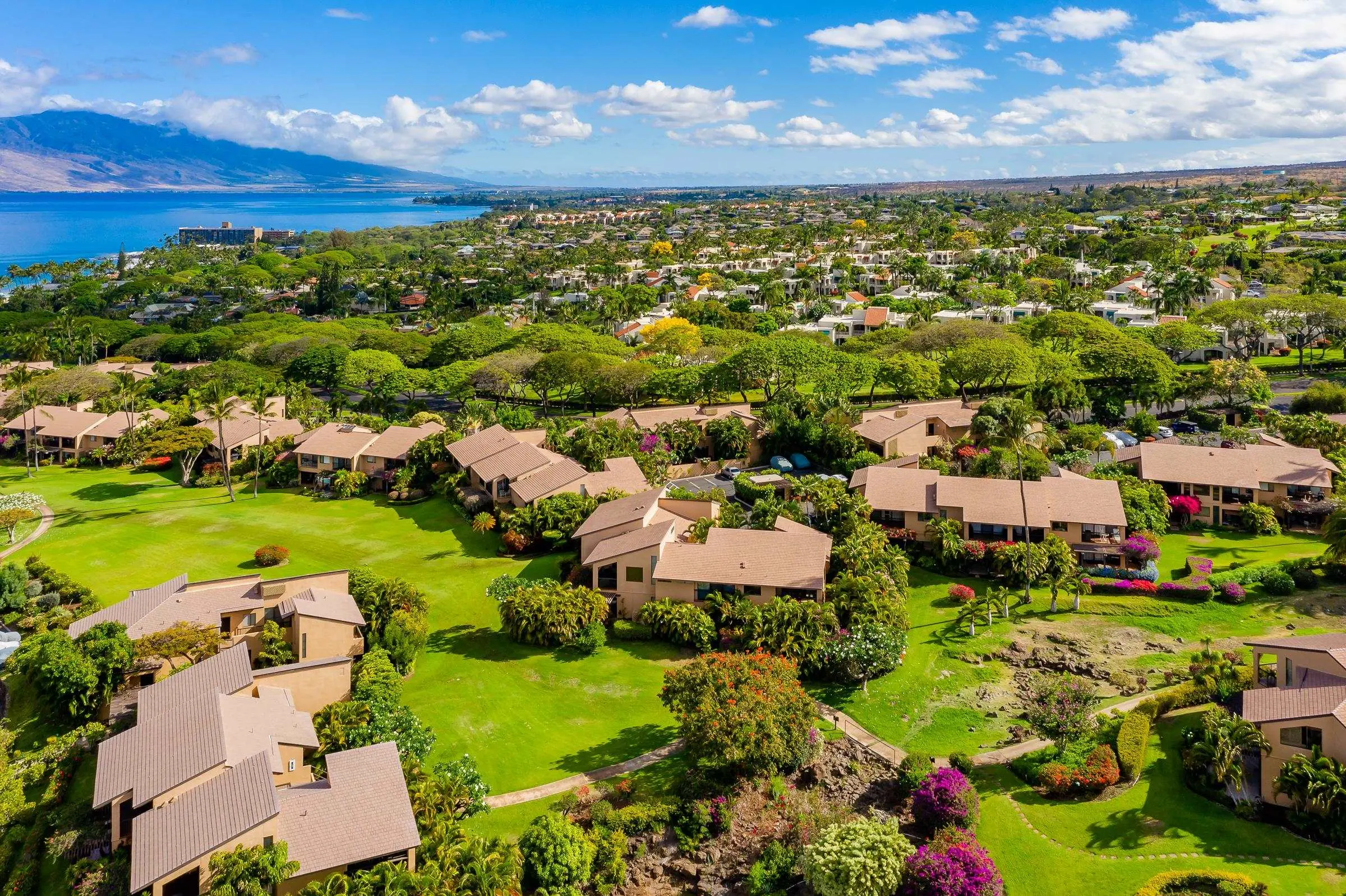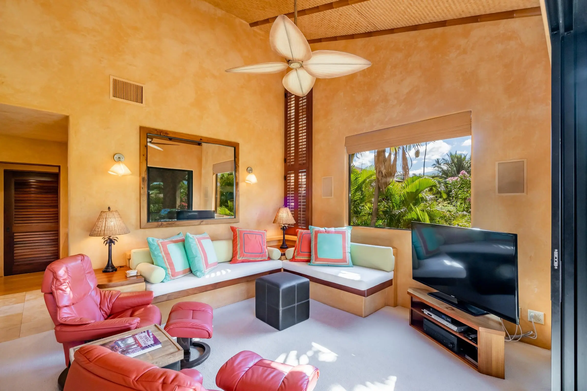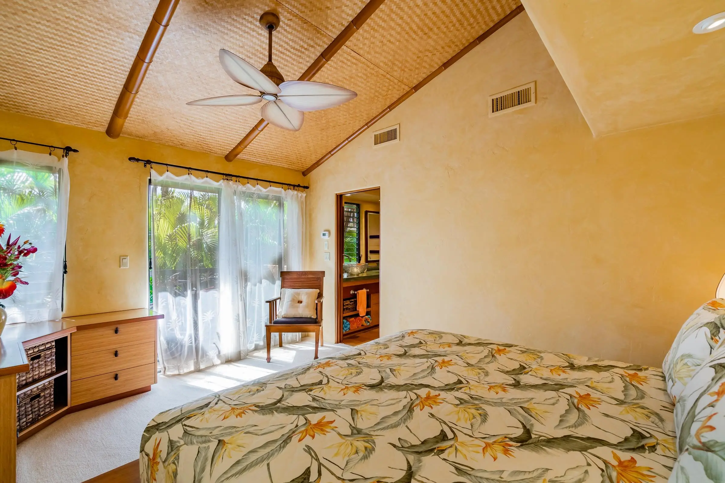 An exceptional co-ownership opportunity awaits in one of the finest & most beautifully renovated units in Wailea Ekahi Village. This fully furnished, turnkey upstairs corner residence is a proven vacation rental and a true architectural standout, thoughtfully redesigned with a rich, sophisticated Balinese-inspired aesthetic. Vaulted ceilings soar overhead, finished in natural lauhala and accented with bamboo beams, while walls are wrapped in luxurious velvet-textured Italian plaster. Flooring transitions seamlessly between travertine, edge-grained bamboo, and plush carpet, creating warmth & elegance throughout. Indoor and outdoor living blend effortlessly as Fleetwood stacking doors open to an ocean-view lanai. Whether relaxing with morning coffee or watching the sun set, this setting is pure Wailea. For warmer afternoons, a new dual split-system air conditioning provides comfort throughout the living space, which also features a custom built-in sofa with mahogany-trimmed end tables, a flat-screen TV, Bluetooth stereo, and in-wall speakers. Expansive custom windows capture ocean & mountain views while filling the condo with natural light. The chef’s kitchen is both artistic and highly functional, featuring hand-cast colored concrete countertops, custom book-matched mango and mahogany cabinetry with oil-rubbed bronze hardware, and mango wood-paneled stainless appliances. A Franke sink with Seagull water purification system complements under-counter refrigeration, including Sub-Zero refrigerator and freezer drawers with ice maker and a Perlick commercial-grade stainless beverage center. The kitchen bar is topped with exotic tropical mango wood and illuminated by colorful halogen pendant lighting — perfect for entertaining or casual island dining. The primary bedroom mirrors the home’s architectural beauty, with vaulted lauhala and bamboo ceilings and peaceful east-facing Haleakala views filtered through handcrafted mahogany shutters. The spa-inspired ensuite bath features dual hand-cast glass vessel sinks, a custom textured glass shower enclosure, and elegant built-in storage. Recessed halogen art lighting and a side-by-side washer and dryer complete this thoughtfully designed interior. This is a rare opportunity to enjoy luxury Wailea living at a fraction of the cost, with ownership in one of Ekahi’s most distinctive and desirable residences — ideal for personal use, rental income, or both.