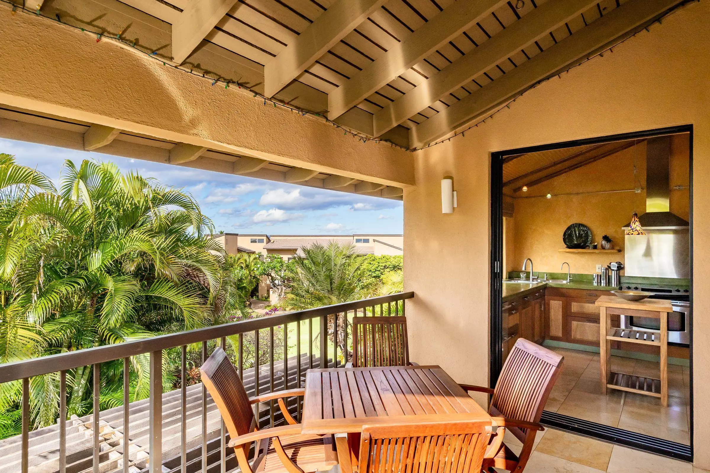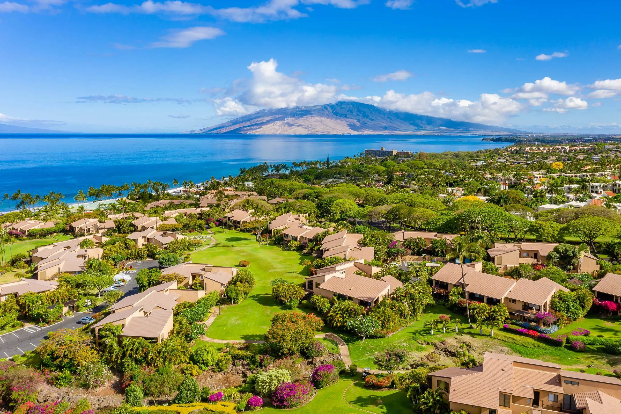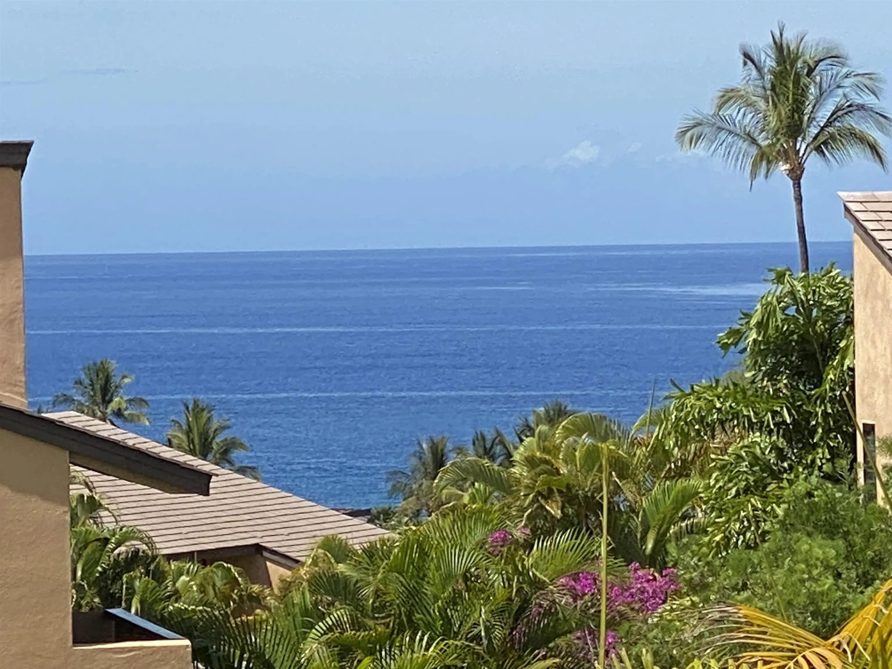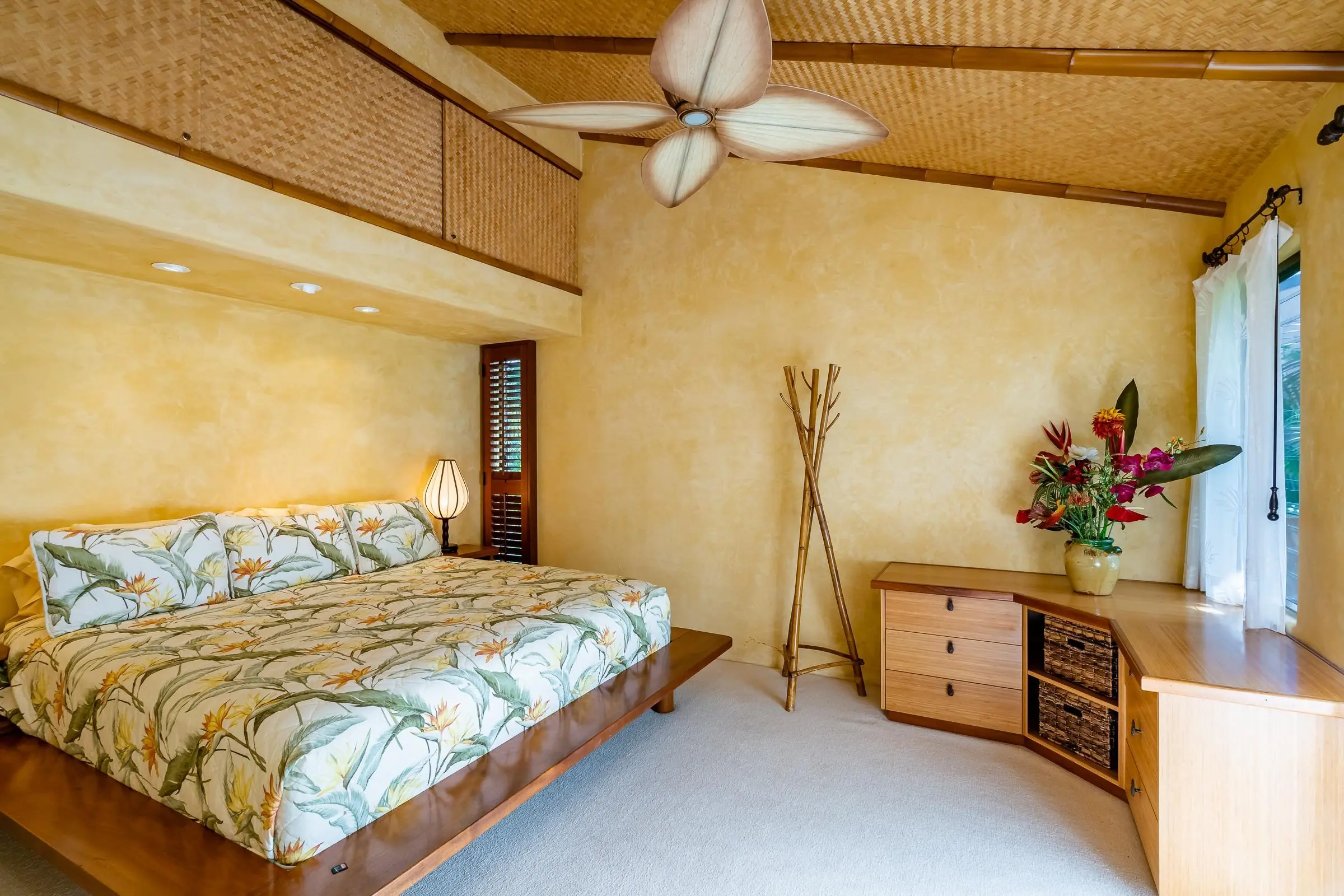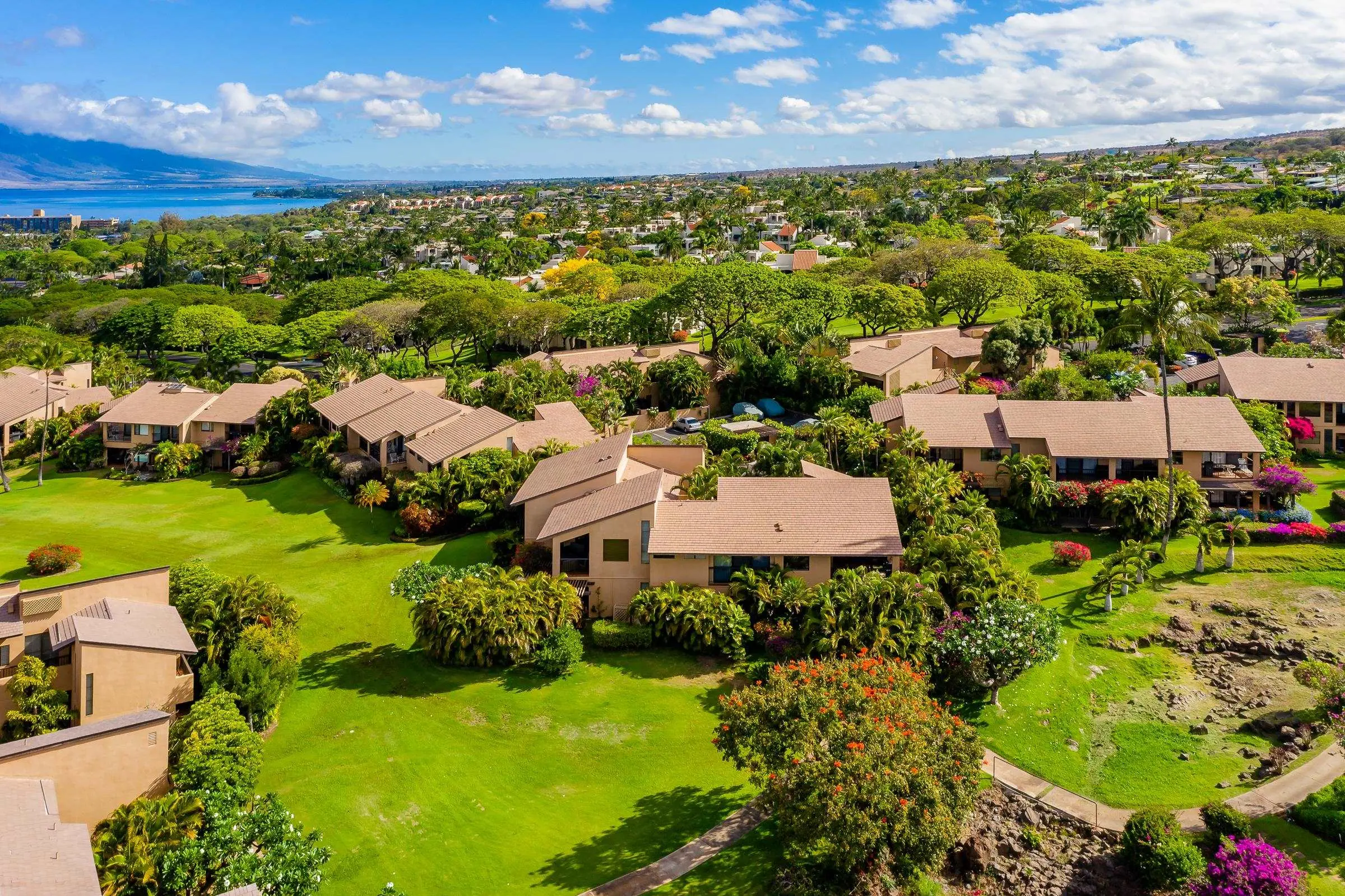 An exceptional co-ownership opportunity awaits in one of the finest & most beautifully renovated units in Wailea Ekahi Village. This fully furnished, turnkey upstairs corner residence is a proven vacation rental and a true architectural standout, thoughtfully redesigned with a rich, sophisticated Balinese-inspired aesthetic. Vaulted ceilings soar overhead, finished in natural lauhala and accented with bamboo beams, while walls are wrapped in luxurious velvet-textured Italian plaster. Flooring transitions seamlessly between travertine, edge-grained bamboo, and plush carpet, creating warmth & elegance throughout. Indoor and outdoor living blend effortlessly as Fleetwood stacking doors open to an ocean-view lanai. Whether relaxing with morning coffee or watching the sun set, this setting is pure Wailea. For warmer afternoons, a new dual split-system air conditioning provides comfort throughout the living space, which also features a custom built-in sofa with mahogany-trimmed end tables, a flat-screen TV, Bluetooth stereo, and in-wall speakers. Expansive custom windows capture ocean & mountain views while filling the condo with natural light. The chef’s kitchen is both artistic and highly functional, featuring hand-cast colored concrete countertops, custom book-matched mango and mahogany cabinetry with oil-rubbed bronze hardware, and mango wood-paneled stainless appliances. A Franke sink with Seagull water purification system complements under-counter refrigeration, including Sub-Zero refrigerator and freezer drawers with ice maker and a Perlick commercial-grade stainless beverage center. The kitchen bar is topped with exotic tropical mango wood and illuminated by colorful halogen pendant lighting — perfect for entertaining or casual island dining. The primary bedroom mirrors the home’s architectural beauty, with vaulted lauhala and bamboo ceilings and peaceful east-facing Haleakala views filtered through handcrafted mahogany shutters. The spa-inspired ensuite bath features dual hand-cast glass vessel sinks, a custom textured glass shower enclosure, and elegant built-in storage. Recessed halogen art lighting and a side-by-side washer and dryer complete this thoughtfully designed interior. This is a rare opportunity to enjoy luxury Wailea living at a fraction of the cost, with ownership in one of Ekahi’s most distinctive and desirable residences — ideal for personal use, rental income, or both.