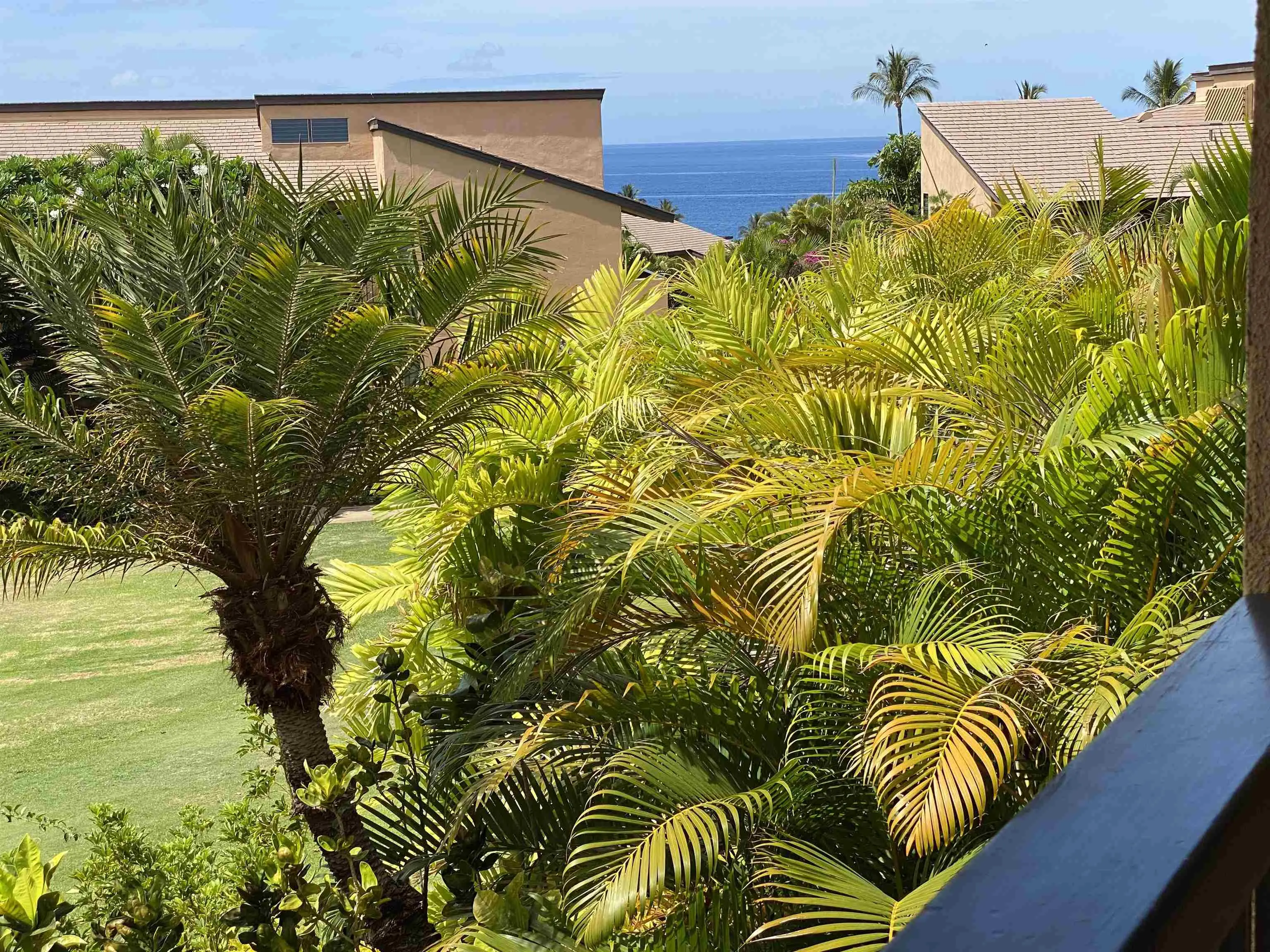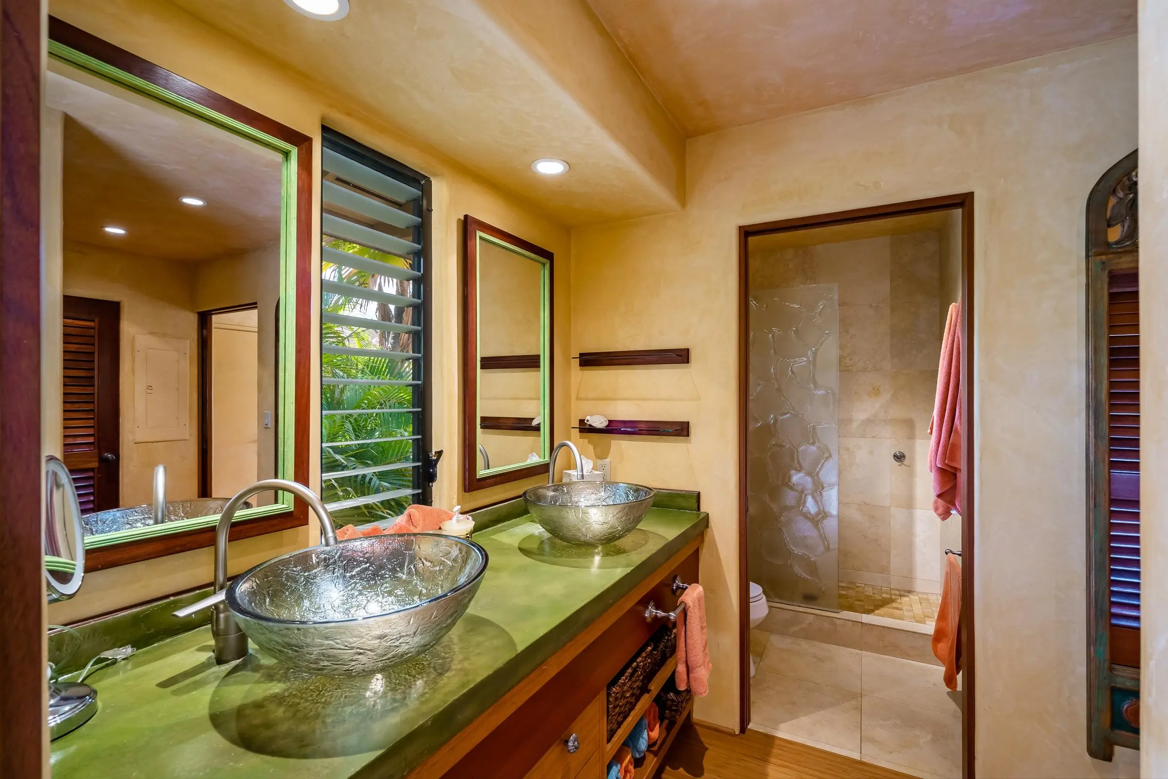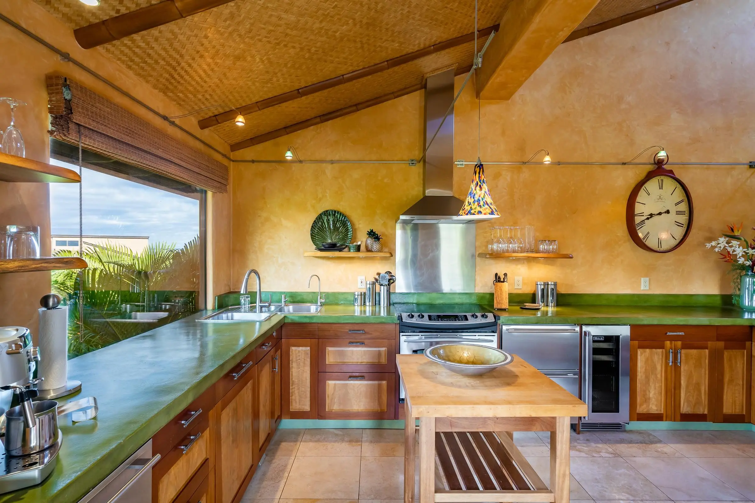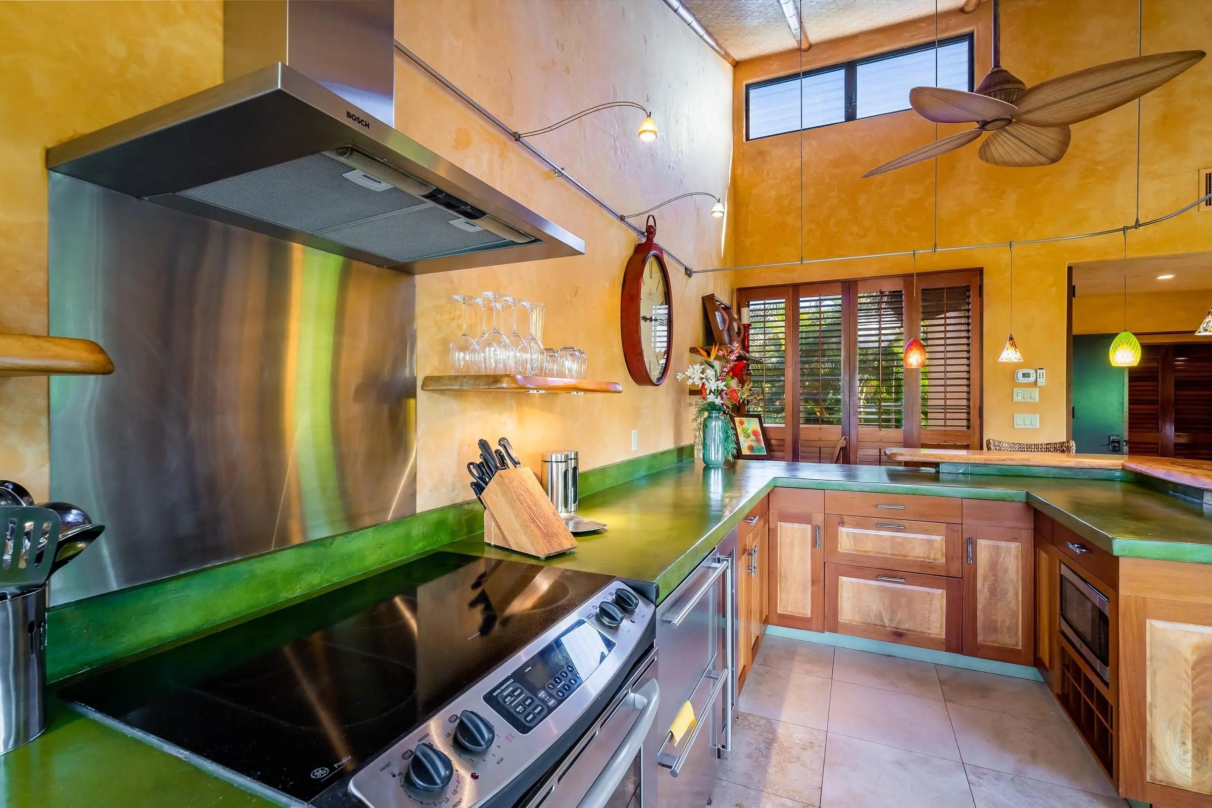 An exceptional co-ownership opportunity awaits in one of the finest & most beautifully renovated units in Wailea Ekahi Village. This fully furnished, turnkey upstairs corner residence is a proven vacation rental and a true architectural standout, thoughtfully redesigned with a rich, sophisticated Balinese-inspired aesthetic. Vaulted ceilings soar overhead, finished in natural lauhala and accented with bamboo beams, while walls are wrapped in luxurious velvet-textured Italian plaster. Flooring transitions seamlessly between travertine, edge-grained bamboo, and plush carpet, creating warmth & elegance throughout. Indoor and outdoor living blend effortlessly as Fleetwood stacking doors open to an ocean-view lanai. Whether relaxing with morning coffee or watching the sun set, this setting is pure Wailea. For warmer afternoons, a new dual split-system air conditioning provides comfort throughout the living space, which also features a custom built-in sofa with mahogany-trimmed end tables, a flat-screen TV, Bluetooth stereo, and in-wall speakers. Expansive custom windows capture ocean & mountain views while filling the condo with natural light. The chef’s kitchen is both artistic and highly functional, featuring hand-cast colored concrete countertops, custom book-matched mango and mahogany cabinetry with oil-rubbed bronze hardware, and mango wood-paneled stainless appliances. A Franke sink with Seagull water purification system complements under-counter refrigeration, including Sub-Zero refrigerator and freezer drawers with ice maker and a Perlick commercial-grade stainless beverage center. The kitchen bar is topped with exotic tropical mango wood and illuminated by colorful halogen pendant lighting — perfect for entertaining or casual island dining. The primary bedroom mirrors the home’s architectural beauty, with vaulted lauhala and bamboo ceilings and peaceful east-facing Haleakala views filtered through handcrafted mahogany shutters. The spa-inspired ensuite bath features dual hand-cast glass vessel sinks, a custom textured glass shower enclosure, and elegant built-in storage. Recessed halogen art lighting and a side-by-side washer and dryer complete this thoughtfully designed interior. This is a rare opportunity to enjoy luxury Wailea living at a fraction of the cost, with ownership in one of Ekahi’s most distinctive and desirable residences — ideal for personal use, rental income, or both.