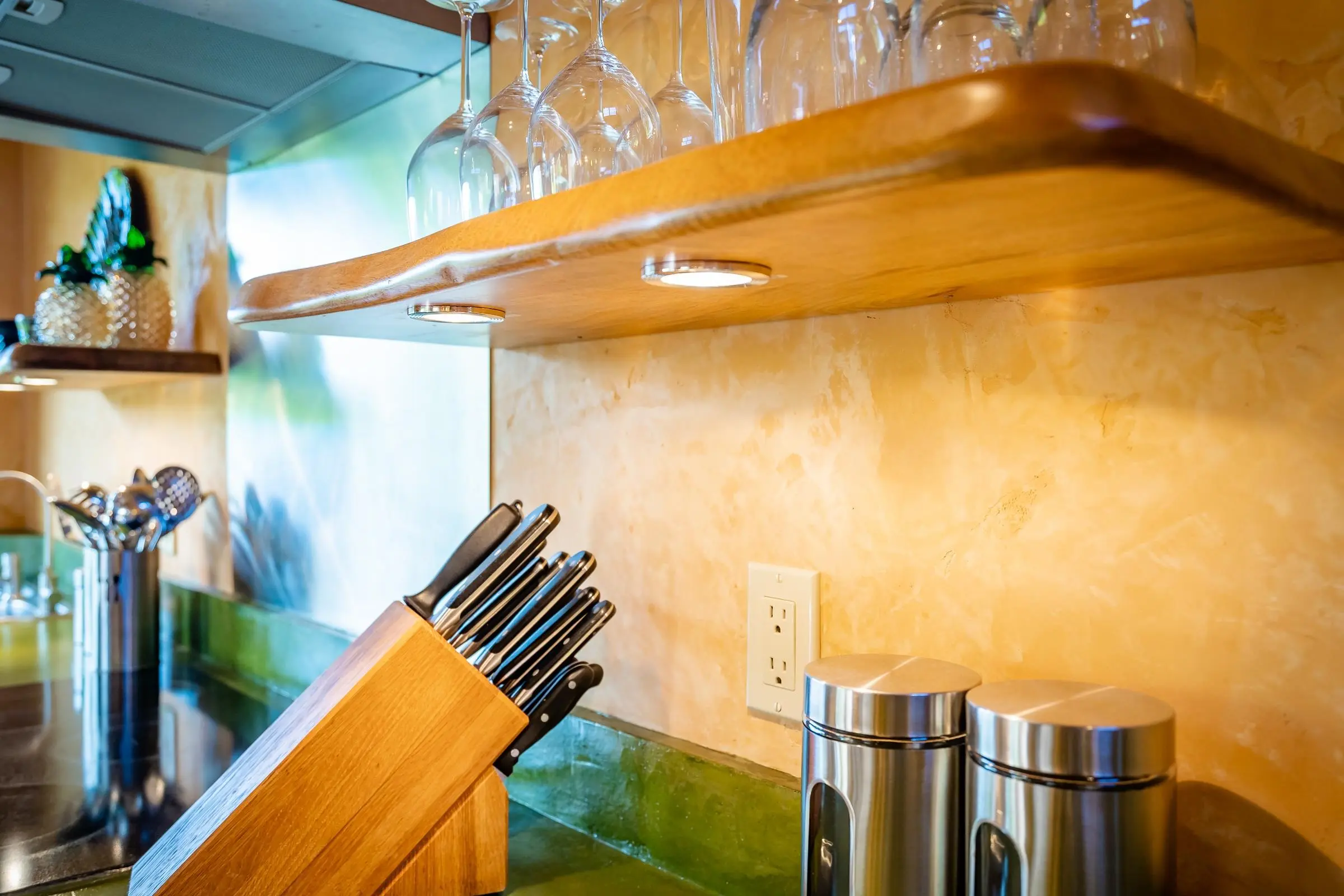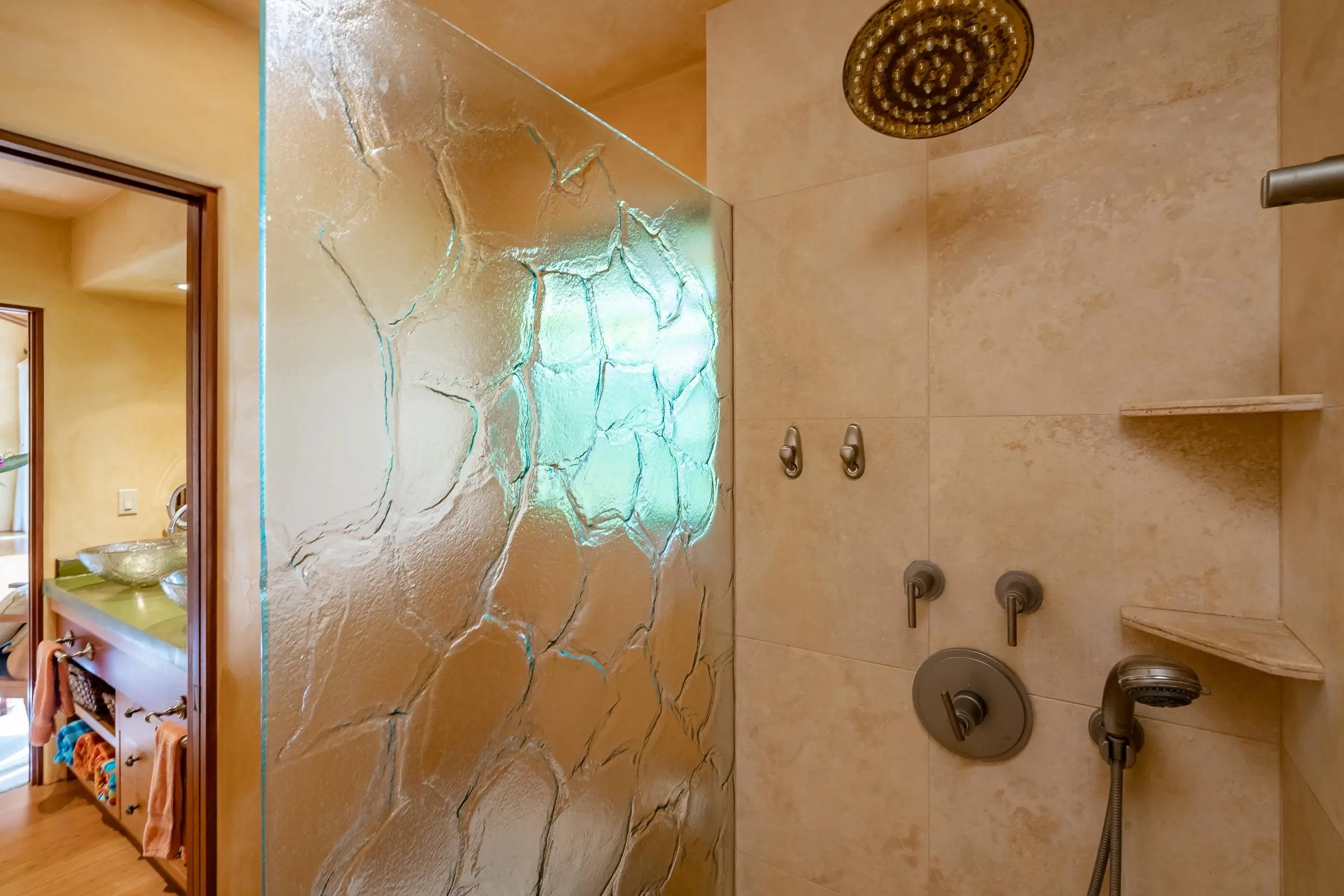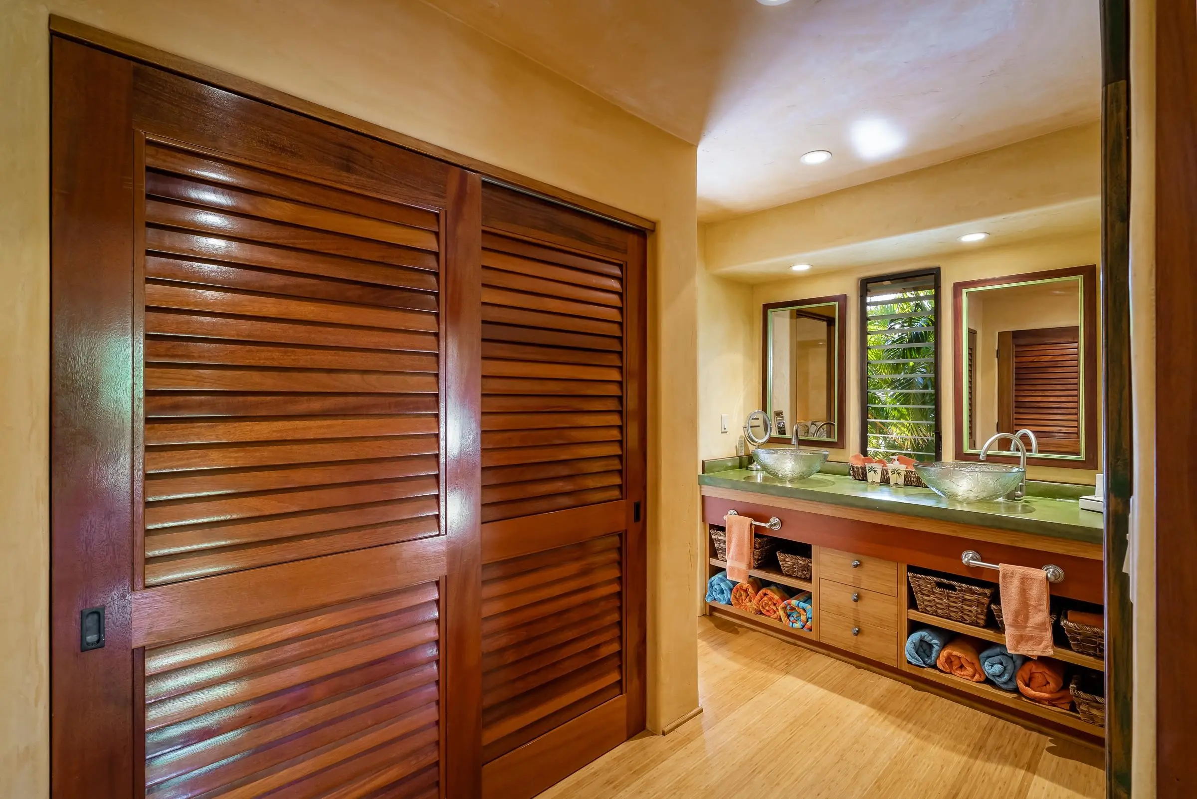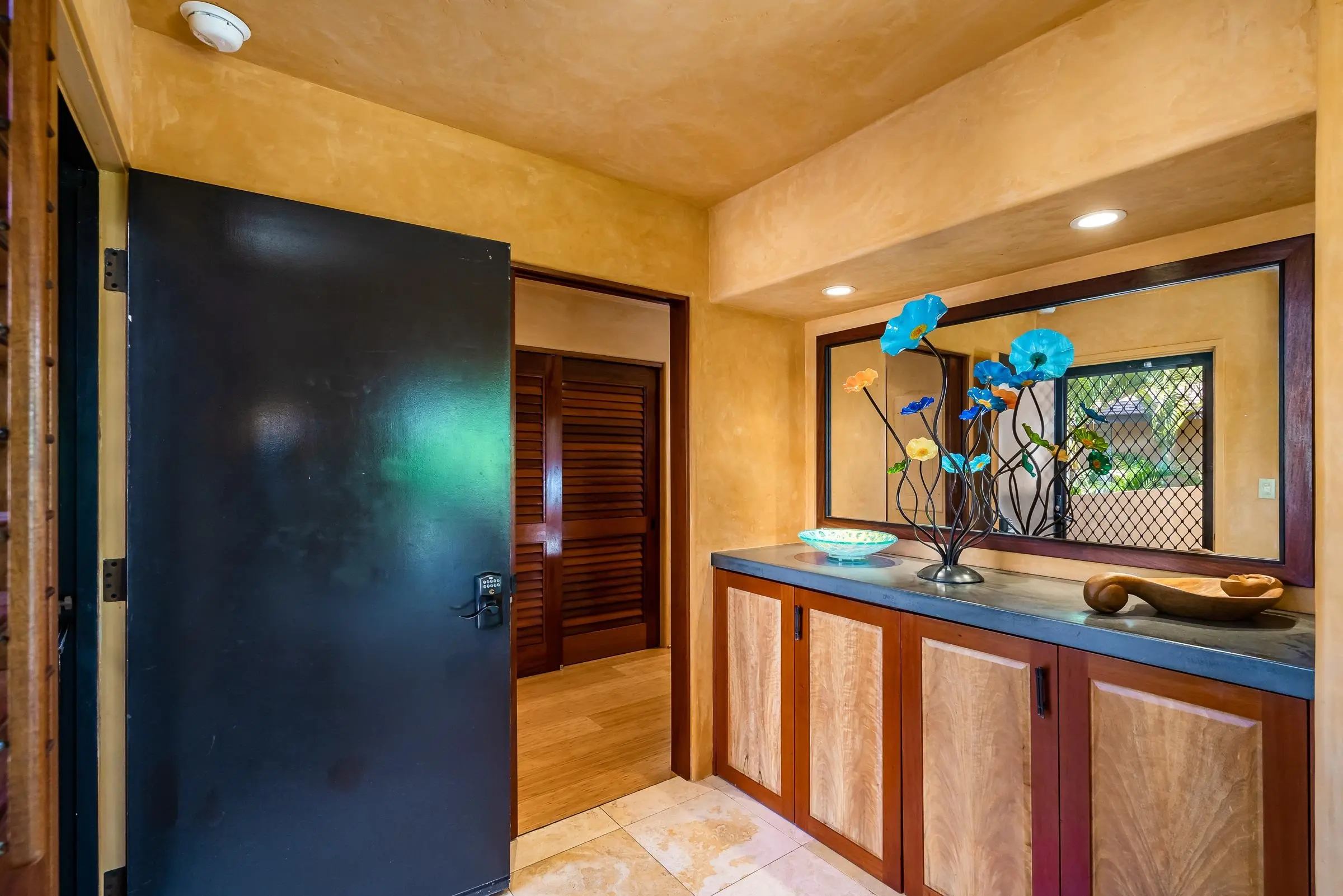 An exceptional co-ownership opportunity awaits in one of the finest & most beautifully renovated units in Wailea Ekahi Village. This fully furnished, turnkey upstairs corner residence is a proven vacation rental and a true architectural standout, thoughtfully redesigned with a rich, sophisticated Balinese-inspired aesthetic. Vaulted ceilings soar overhead, finished in natural lauhala and accented with bamboo beams, while walls are wrapped in luxurious velvet-textured Italian plaster. Flooring transitions seamlessly between travertine, edge-grained bamboo, and plush carpet, creating warmth & elegance throughout. Indoor and outdoor living blend effortlessly as Fleetwood stacking doors open to an ocean-view lanai. Whether relaxing with morning coffee or watching the sun set, this setting is pure Wailea. For warmer afternoons, a new dual split-system air conditioning provides comfort throughout the living space, which also features a custom built-in sofa with mahogany-trimmed end tables, a flat-screen TV, Bluetooth stereo, and in-wall speakers. Expansive custom windows capture ocean & mountain views while filling the condo with natural light. The chef’s kitchen is both artistic and highly functional, featuring hand-cast colored concrete countertops, custom book-matched mango and mahogany cabinetry with oil-rubbed bronze hardware, and mango wood-paneled stainless appliances. A Franke sink with Seagull water purification system complements under-counter refrigeration, including Sub-Zero refrigerator and freezer drawers with ice maker and a Perlick commercial-grade stainless beverage center. The kitchen bar is topped with exotic tropical mango wood and illuminated by colorful halogen pendant lighting — perfect for entertaining or casual island dining. The primary bedroom mirrors the home’s architectural beauty, with vaulted lauhala and bamboo ceilings and peaceful east-facing Haleakala views filtered through handcrafted mahogany shutters. The spa-inspired ensuite bath features dual hand-cast glass vessel sinks, a custom textured glass shower enclosure, and elegant built-in storage. Recessed halogen art lighting and a side-by-side washer and dryer complete this thoughtfully designed interior. This is a rare opportunity to enjoy luxury Wailea living at a fraction of the cost, with ownership in one of Ekahi’s most distinctive and desirable residences — ideal for personal use, rental income, or both.