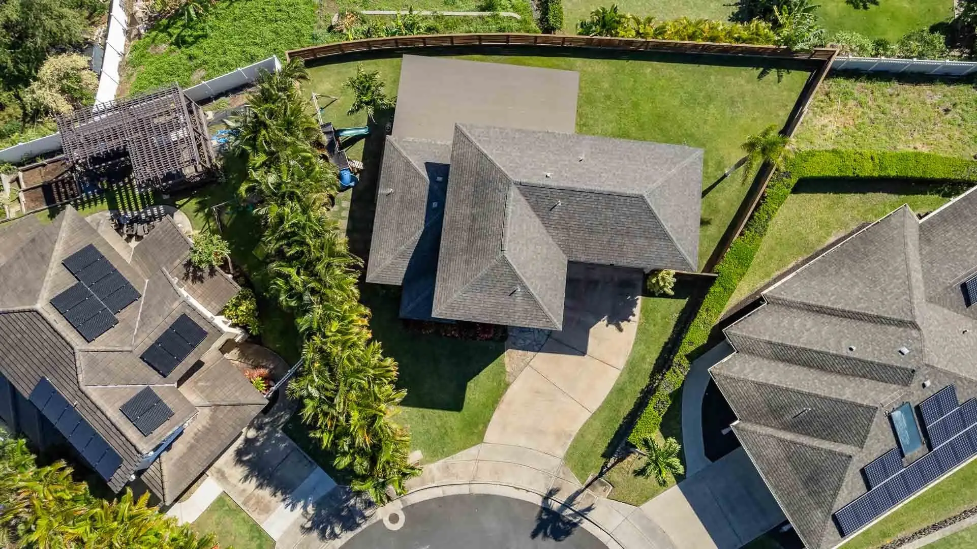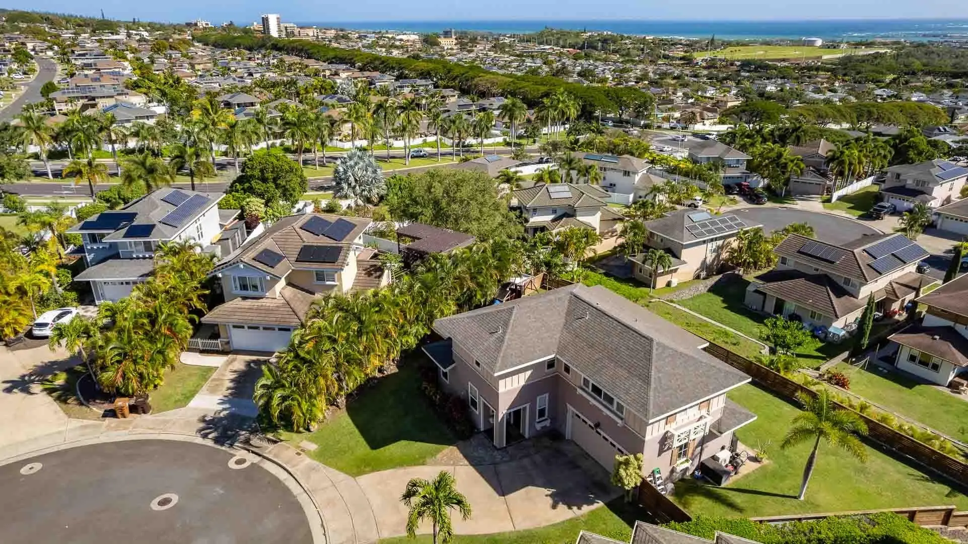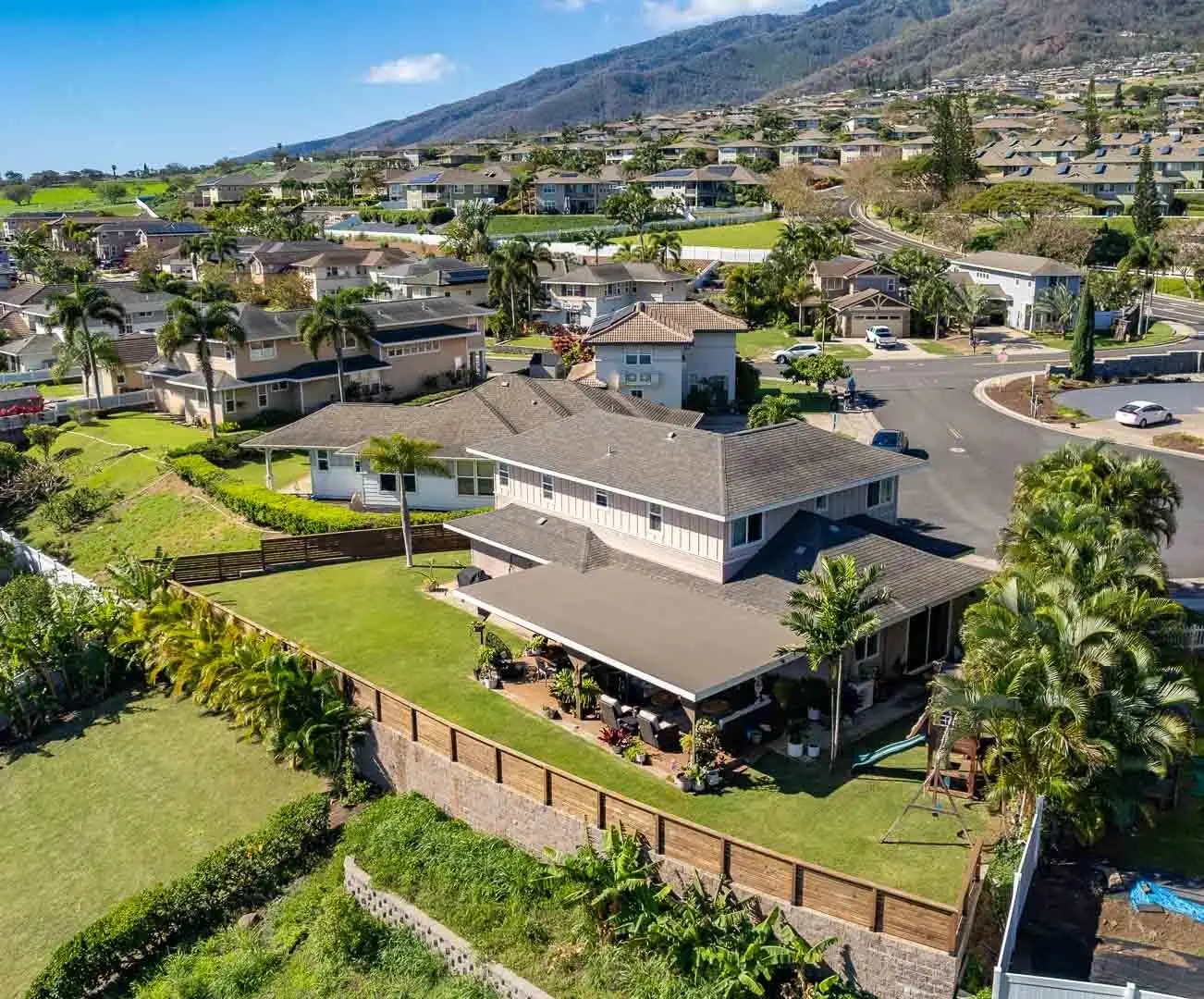 Entertainer’s delight! Owners transformed this property into one of the premier properties in the master-planned community of Kehalani, ideal for relaxing under a super-sized covered lanai, and taking advantage of serene ocean and Haleakala mountain views. Building a retaining wall and bringing in fill created an area for a wide, manicured lawn and an expansive covered lanai. The meticulously maintained residence is a one-of-a-kind breathtaking locale for welcoming friends and family. Visitors are surprised by the sense of privacy in a location so convenient. The lower level features engineered hardwood floors in the living room, dining area, and family room. The family room opens to the extra-large covered lanai with stamped concrete and Trex flooring, and a sprinklered back yard, which is also accessible from side gates. The kitchen, with seating at the island with granite counter-tops, includes a new Bosch dishwasher, a double-oven range, refinished cabinets and porcelain tile floors. A fun under-stairs play area, half-bathroom with bidet and 2-car garage with Tesla charger (compatible to other EV vehicles with an adaptor) in front of the home are also on the ground level. 3 bedrooms and 2 remodeled bathrooms are located upstairs, with ocean and mountain views. The property comes with 2 Mitsubishi split air-conditioners (master bedroom and downstairs.)